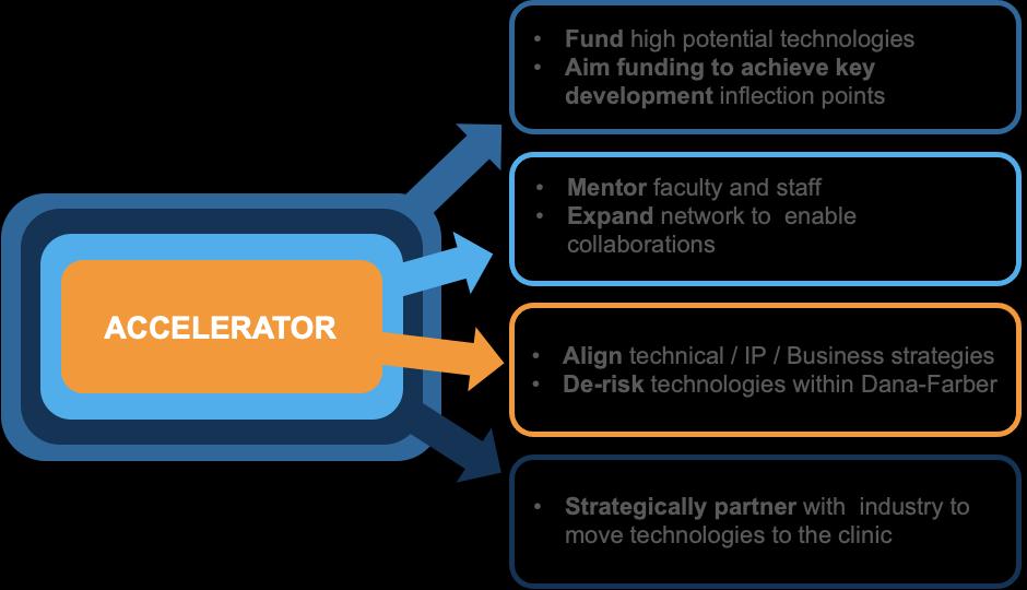 The Dana-Farber Accelerator is focused on the translation of scientific discovery from institute investigators into first-in-class technologies with the potential to create significant impact for patients worldwide. We identify investigators taking on high risk, novel science, who, with early-stage funding and mentorship, can address key developmental questions to transition from idea to potential novel technology.Accelerator funding is focused on critical inflection points in technology development that allow investigators to pressure test assumptions and answer critical questions about the technology's potential to translate into a therapeutic or diagnostic for patients with cancer or related diseases. We align technical, business, and intellectual property strategies to enable subsequent collaboration with the best partner who will further the next stage of development towards commercialization.