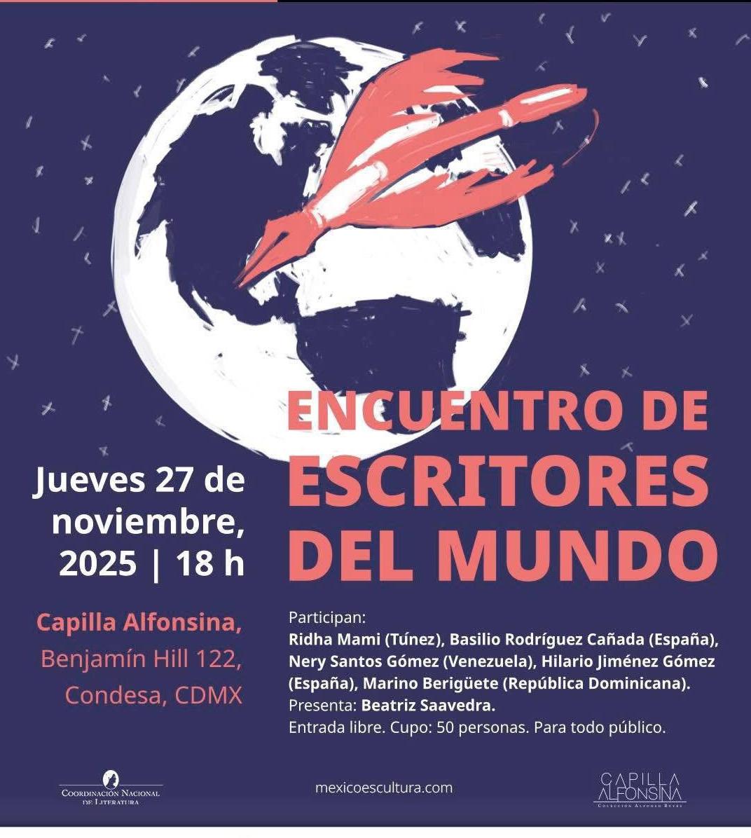 El encuentro se realizará el jueves 27 de noviembre de 2025, a las 18 h en la Capilla Alfonsina, ubicada en General Benjamín Hill 122, colonia Hipódromo Condesa, Ciudad de México. Participan cinco escritores de cuatro nacionalidades: Ridha Mami (Túnez), Nery Santos Gómez (Venezuela), Marino Berigüete (República Dominicana) y Basilio Rodríguez Cañada e Hilario Jiménez Gómez (España).
