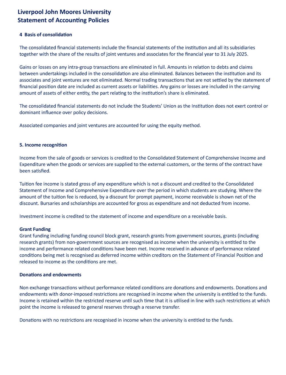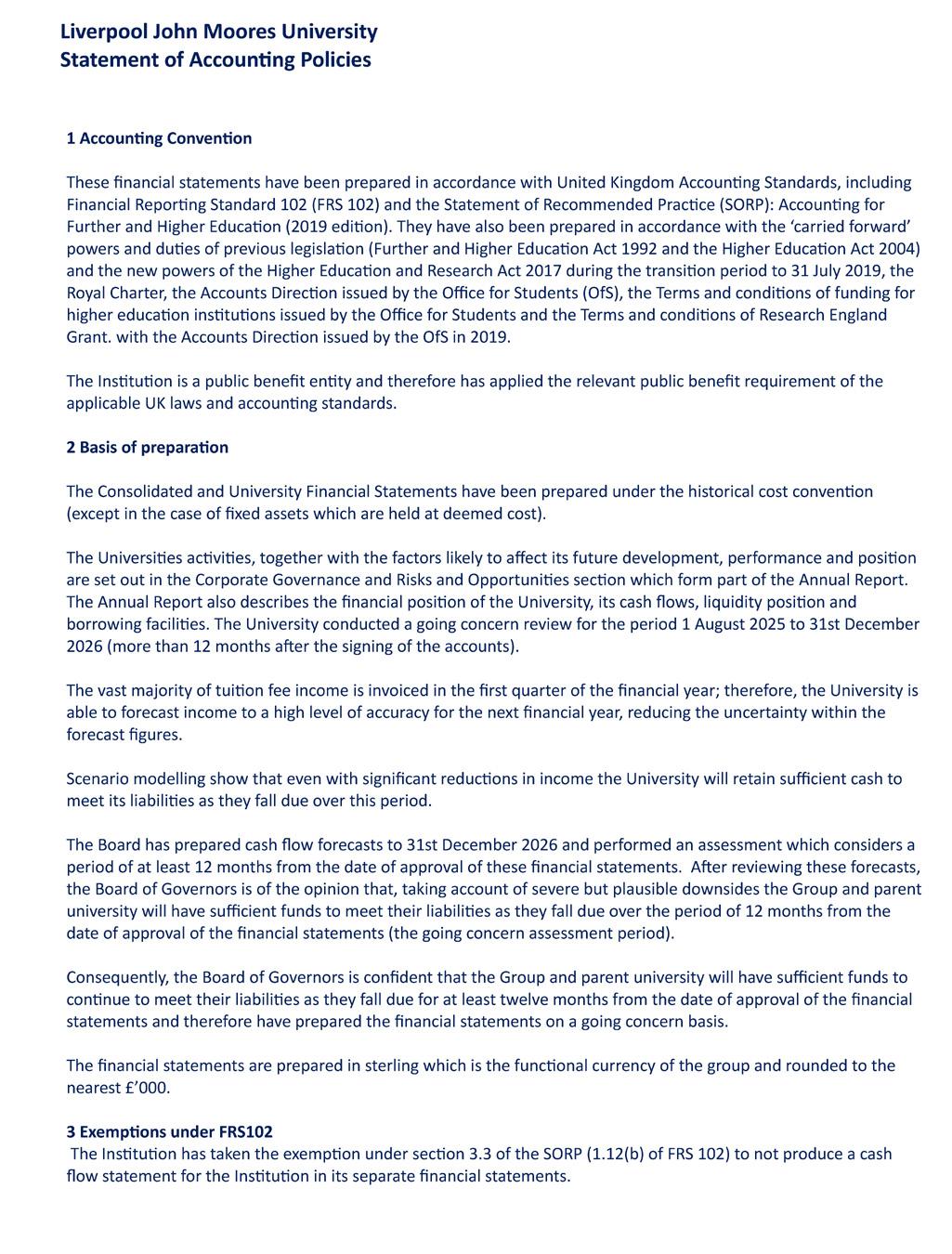 • Use the going concern basis of accounting unless it either intends to liquidate the group or the parent University or to cease operations, or have no realistic alternative but to do so.