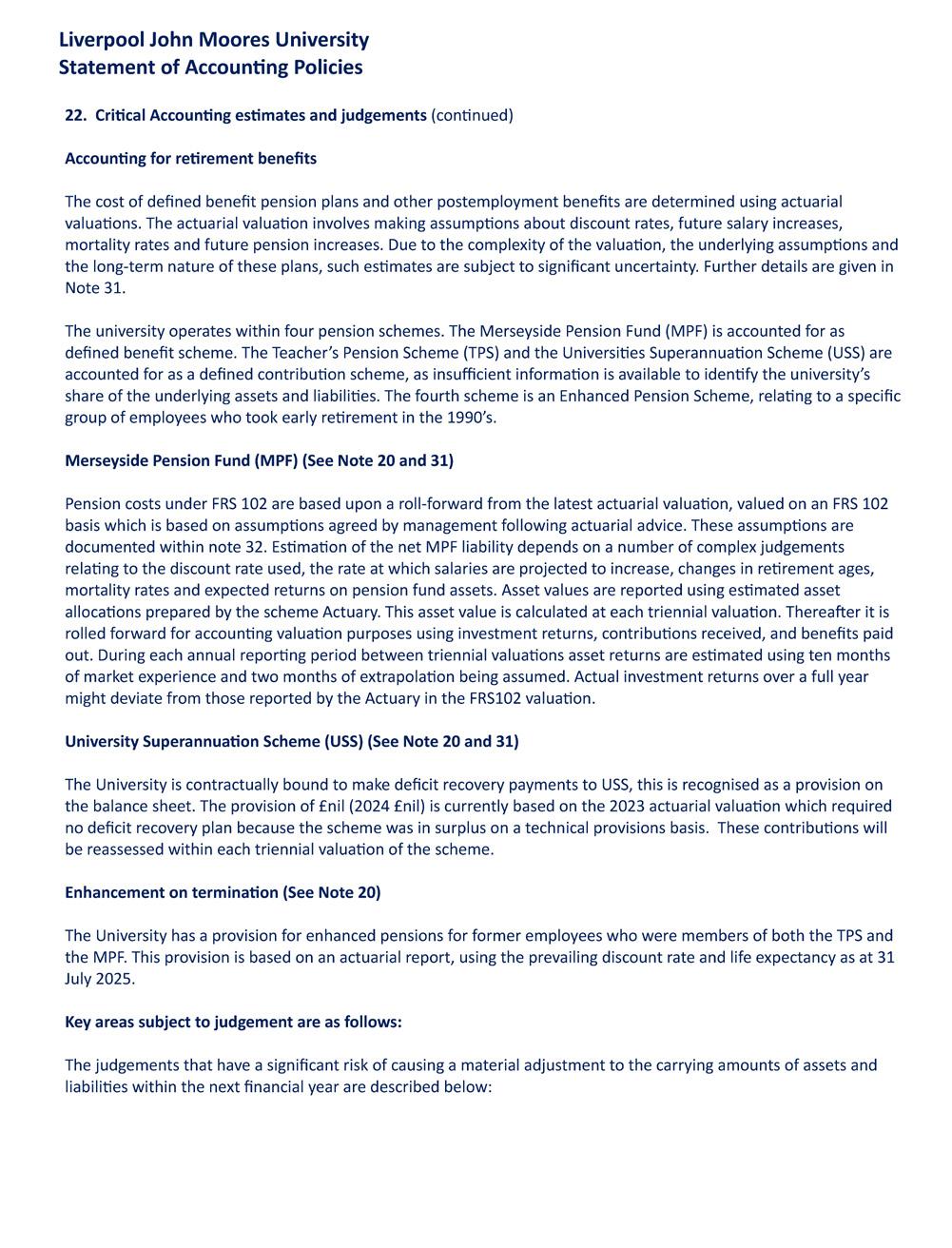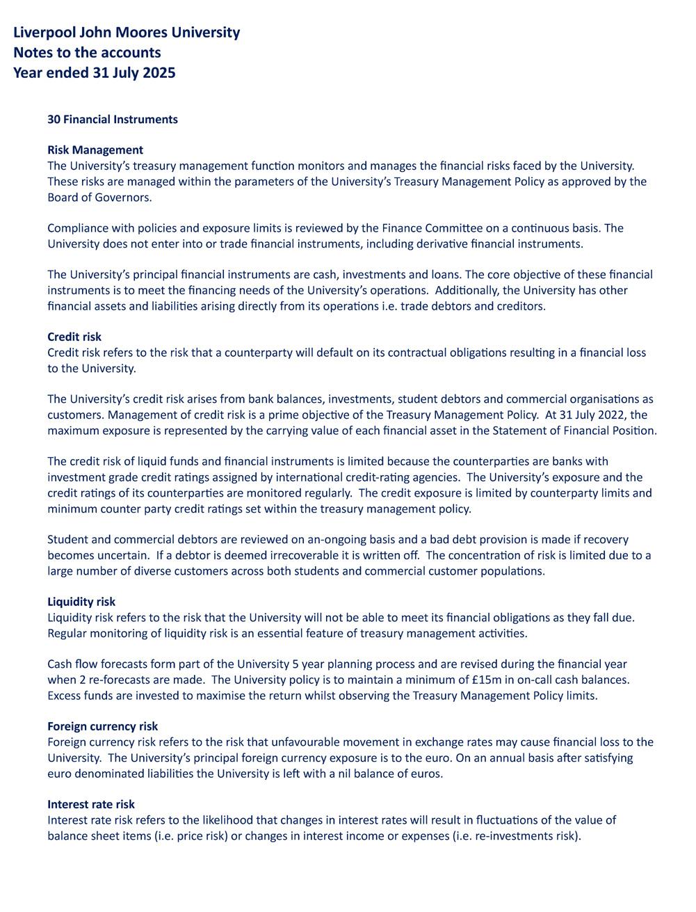 • The university has an agreed Risk Management Policy and a Risk Appetite Statement. Responsibility for identifying and evaluating the major risks faced by the university and for ensuring that appropriate mitigating measures are in place, sits with the Executive Leadership Team, which has considered the institutional register three times in the year ended 31st July 2025. The institutional risk register is reviewed by the Audit and Risk Committee throughout the year and the Finance Committee reviews the high-level financial risks annually. The Board of Governors’ agenda includes a standard item for consideration of relevant or emerging risks and the Board and ELT remain committed to the review and refinement of risk management procedures.