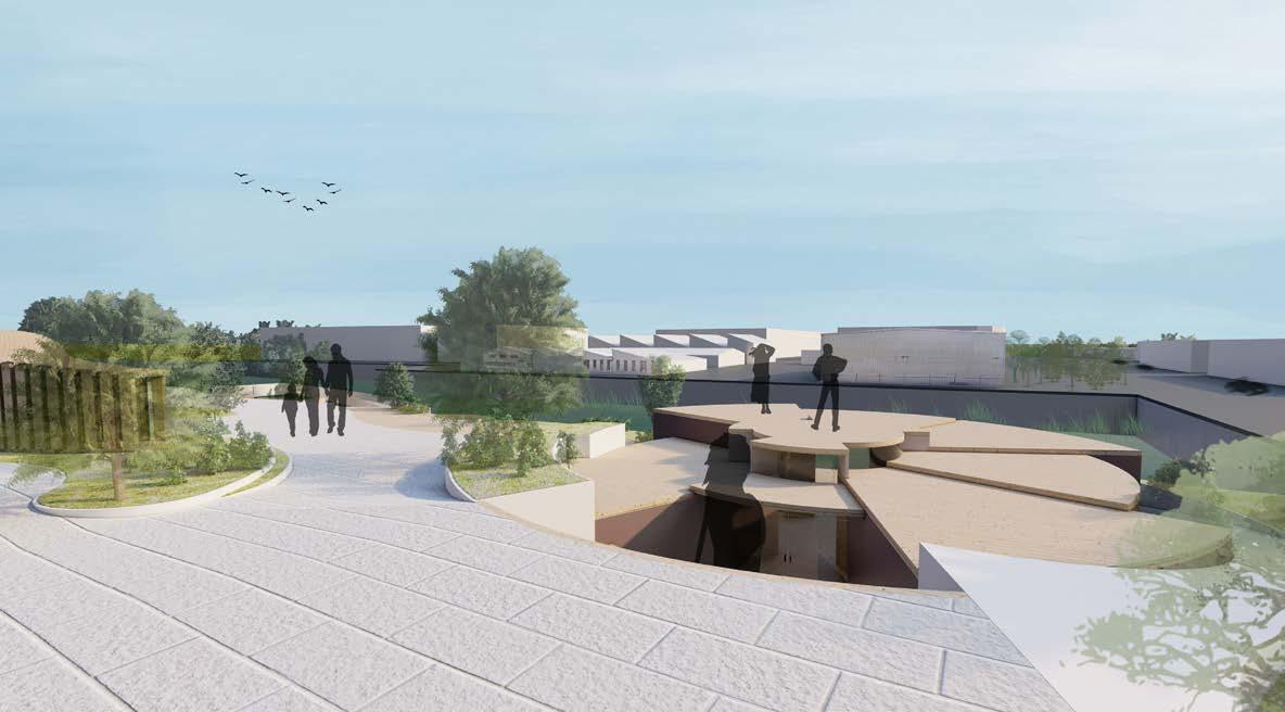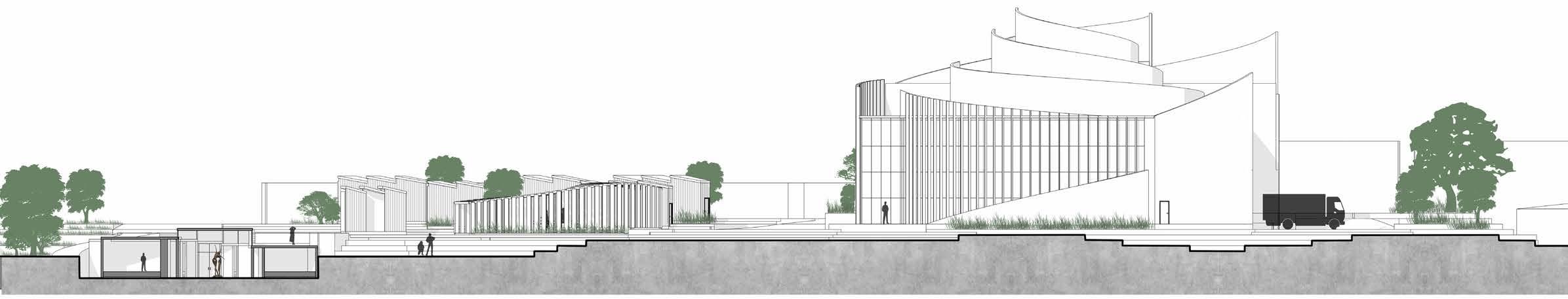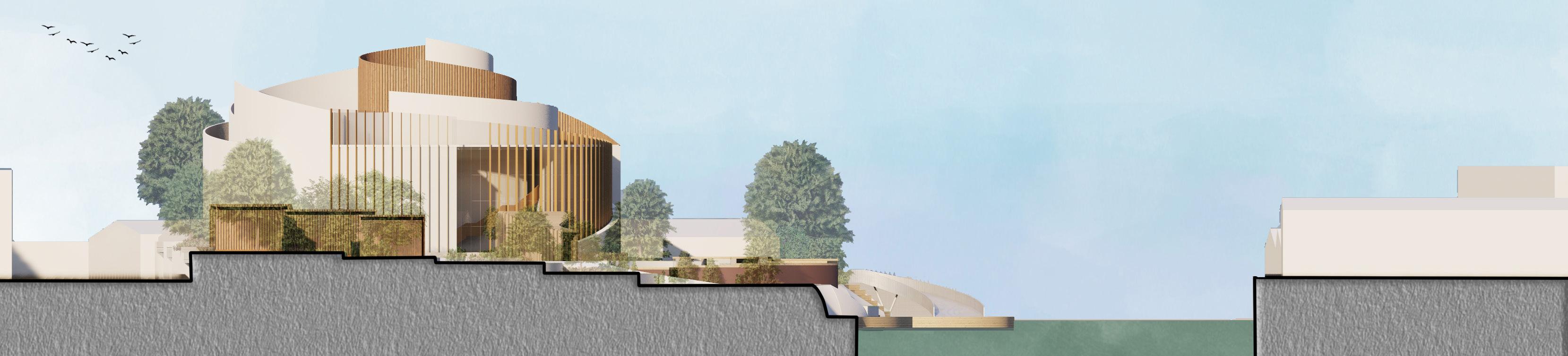 The design offers a narrative-driven experience, guiding visitors who have also left behind their creative passions. Entering from the back of the site, the journey begins with a life exhibition hidden underground near the water, a quiet space for reflection. Emerging to ground level, visitors move through small pavilions and sunken outdoor amphitheatre, spaces that encourage interaction and expression. The path culminates at the main theatre, a tall, sculptural form symbolising rebirth and continuation.