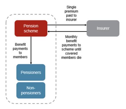 The scheme pays a fixed premium to an insurer, and in return, the insurer takes on responsibility for meeting the insured benefits, along with the interest rate, inflation, longevity and demographic risks associated with those benefits