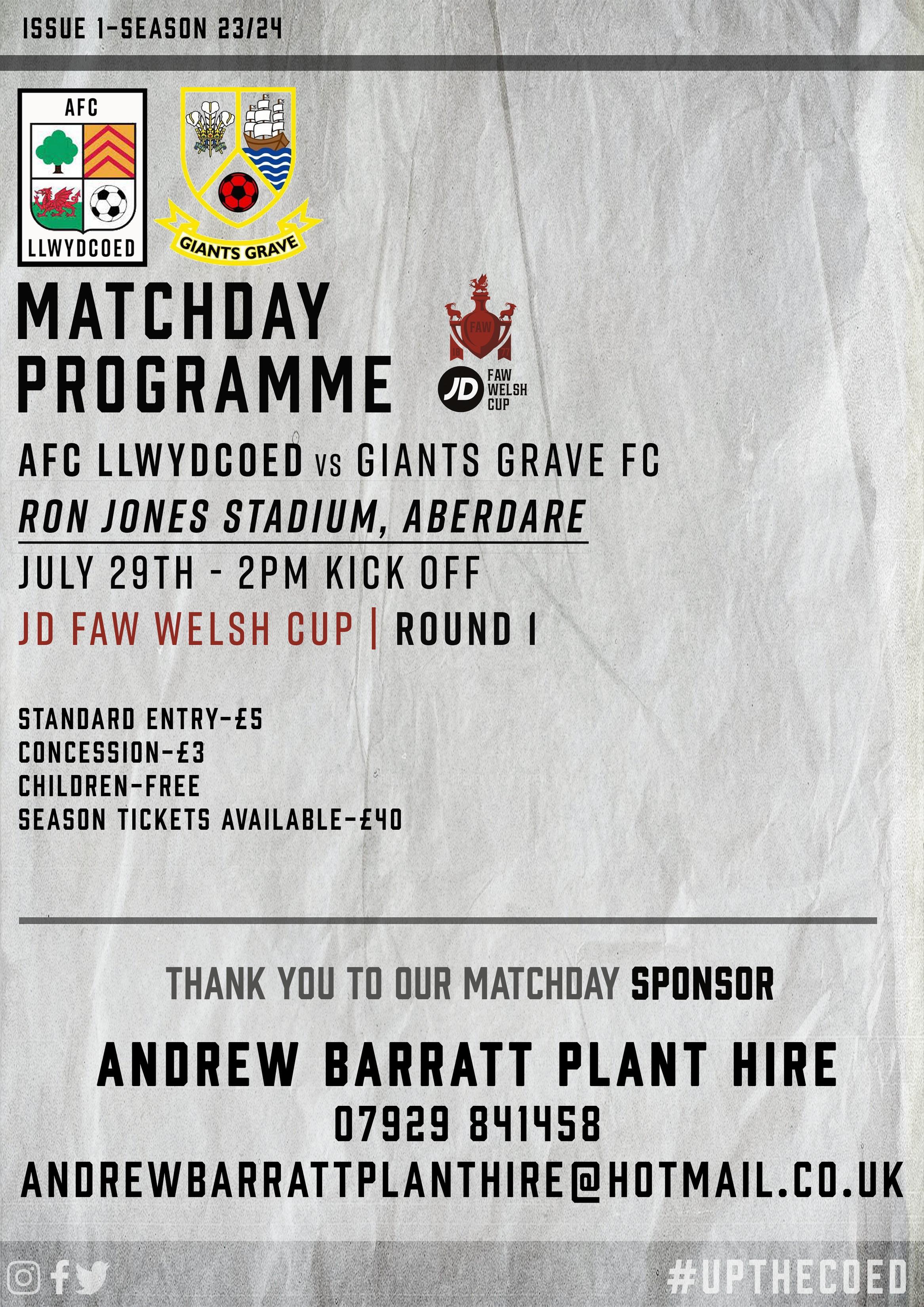 Match Day Programme vs Giants Grave JD FAW WELSH CUP RD 1