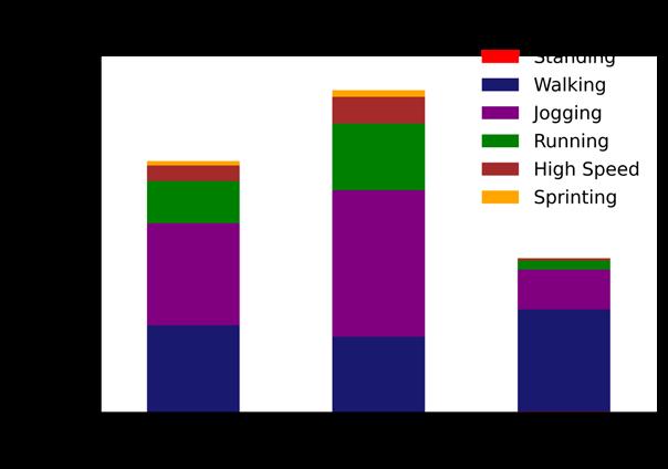 Stats Perform tracking data were used to derive the distances (m) and rates of distance (m•min-1) covered: standing (<0.16 m•s-1), walking (0.16-1.97 m•s-1), jogging (1.97-3.97 m•s-1), running (3.97-5.47 m•s-1), high-speed (5.47-7.0 m•s-1), sprinting (> 7.0 m•s-1) and total distance.