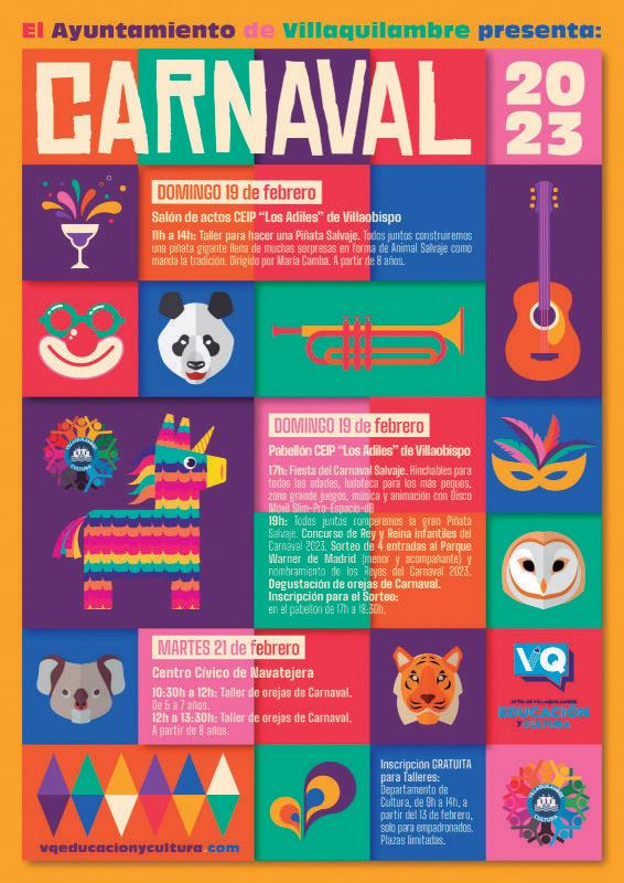 La programación también cuenta, el lunes 20 de febrero, con dos talleres infantiles para niños de entre 3 y 12 años, y el martes 21 de febrero con el desfile infantil que, como viene siendo tradición, tendrá su salida en las antiguas escuelas (c/ Alonso Castrillo) a las 17:00 horas y culminará con una minidisco con juegos infantiles y pintacaras en el Espacio Joven.