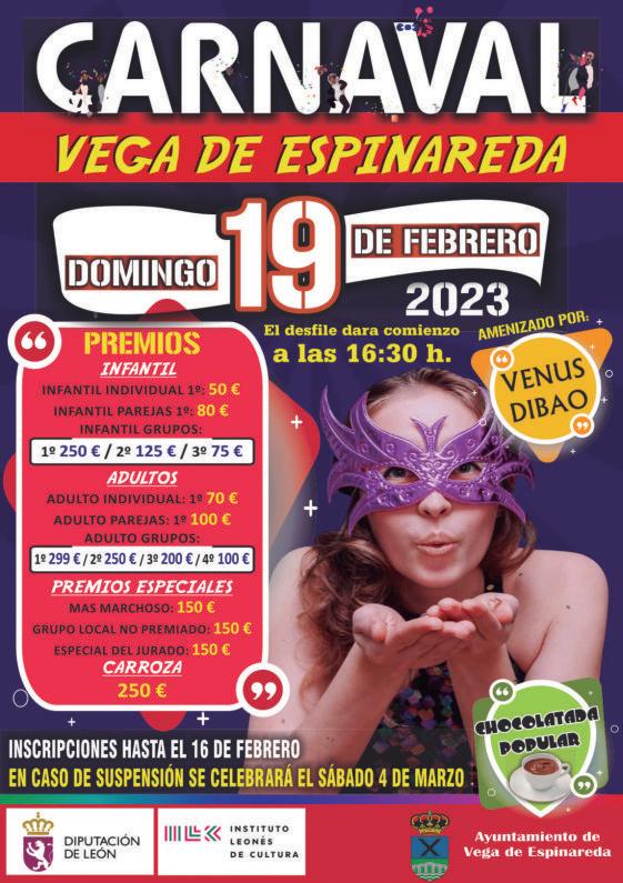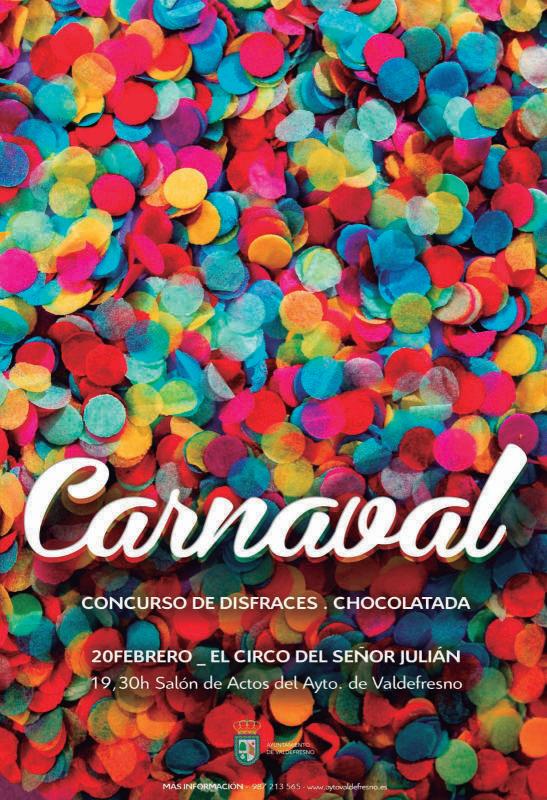 El salón de actos del Ayuntamiento de Valdefresno acogerá, el 20 de febrero a las 19:30 horas, el concurso de disfraces en el que no faltará la chocolatada para compartir entre todos los presentes. Además, otro de los actos es el espectáculo ‘El circo del señor Julián’ de la mano de una compañía de circo con payasos clásicos que harán las delicias de grandes y chicos.