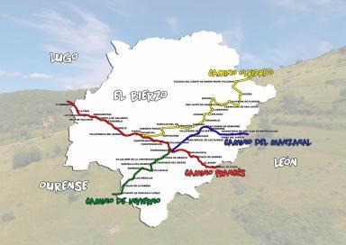 Sin duda, el camino Francés es el más destacado. Declarado por el Consejo de Europa Primer Itinerario Cultural Europeo en 1987 y Patrimonio Mundial por la UNESCO en 1993 es la ruta de mayor relevancia histórica y el más seguido. Su punto de inicio es Roncesvalles. En el tramo correspondiente al Bierzo, podemos destacar las siguientes localidades: El Acebo es un pueblo medieval que gozó de privilegios reales a cambio de que sus habitantes colocasen 800 palos en el Camino de Santiago, que unía este pueblo con la Hospedería de Foncebadón, para servir de guía en las crudas nevadas de invierno. Riego de Ambrós es un pueblo en el que se conservan ejemplos bien conservados de arquitectura popular berciana. La iglesia de Santa María Magdalena, del siglo XVI, y la ermita de San Sebastián son los dos monumentos de interés de la localidad. Molinaseca es una villa medieval a la cual se accede por la conocida calle Real, que combina una bien conservada arquitectura tradicional y casa blasonadas. En sus restaurantes y mesones se puede degustar platos típicos de la gastronomía berciana. Ponferrada es la capital de El Bierzo. En el siglo XI el obispo Osmundo ordena construir un puente sobre el río Sil para facilitar el paso de los peregrinos. El Castillo de los Templarios, la Basílica de la Encina, los museos,… son visitas recomendadas. Tras pasar por Fuentesnuevas y Columbrianos, el Camino llega a Camponaraya, que contó en la Edad Media con dos hospitales para peregrinos, Soledad y San Juan de Jabero. Cacabelos es una villa importante de la Ruta Jacobea, ubicada en plena hoya berciana. Llama la ateción por sus tierras fértiles de variada vegetación, frutales y viñedos. La cuesta de Pieros nos da acceso al castro de Castroventosa, que comparte territorio con Villafranca, sobre un cerro a 638 m de altitud. De origen prerromano, se ha localizado en este lugar el poblado Berguidae. Villafranca, ‘la pequeña Compostela’, tiene un pasado muy vinculado a las peregrinaciones. En la Puerta del Perdón de la iglesia de Santiago puedes obtener las mismas indulgencias que en la catedral compostelana si no puedes continuar por una