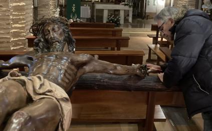 La imagen del Santo Cristo de la Bienaventuranza que procesiona la penitencial de San Claudio cada mañana de Jueves Santo –y que recibe culto en la parroquia de San Miguel Arcángel de Navatejera– ha sido reciente-