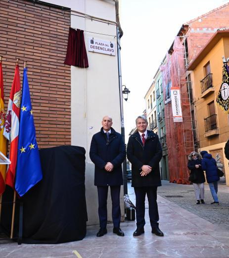 :: Ayer fue descubierta la placa de la ‘Plaza del Desenclavo’ –en la confluencia de las calles Serranos y Pablo Flórez, frente al colegio Ponce de León, como fue aprobado por el pleno municipal el pasado 29 de noviembre–, en un acto que contó con el alcalde de León, José Antonio Diez –entre otras autoridades–y representantes de las cofradías y hermandades, y en el que participó la agrupación musical del Desenclavo.
