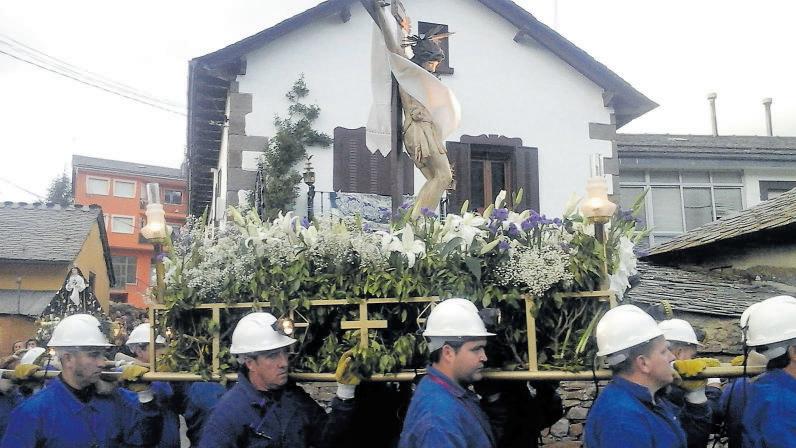 neros. Lejos de los típicos capillos y las túnicas de estos actos, en ella se puede a ver a los mineros portando la imagen de Cristo con la cara descubierta, ataviados con sus fundas y sus cascos. Ellas, las mujeres que portan a la Virgen Dolorosa, de riguroso negro. La emotiva peregrinación parte de la iglesia de la localidad con destino al Pozo María, donde suena la sirena que antaño marcaba los turnos en la mina. Allí, cada año se homenajea la memoria de todos aquellos que dejaron su vida en la mina. Además, en esta edición se celebra el 50 aniversario de la Banda de Cornetas y Tambores.