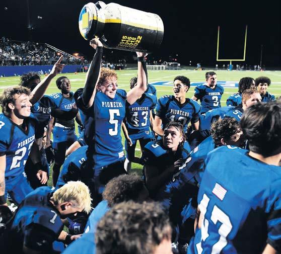 LampeterStrasburg’s Keegan Cutis hoists the Milk Jug trophy after the Pioneers earned a 45-44 win over visiting Solanco in overtime on Aug. 22. The annual rivalry game opened the 2025 season for both teams.