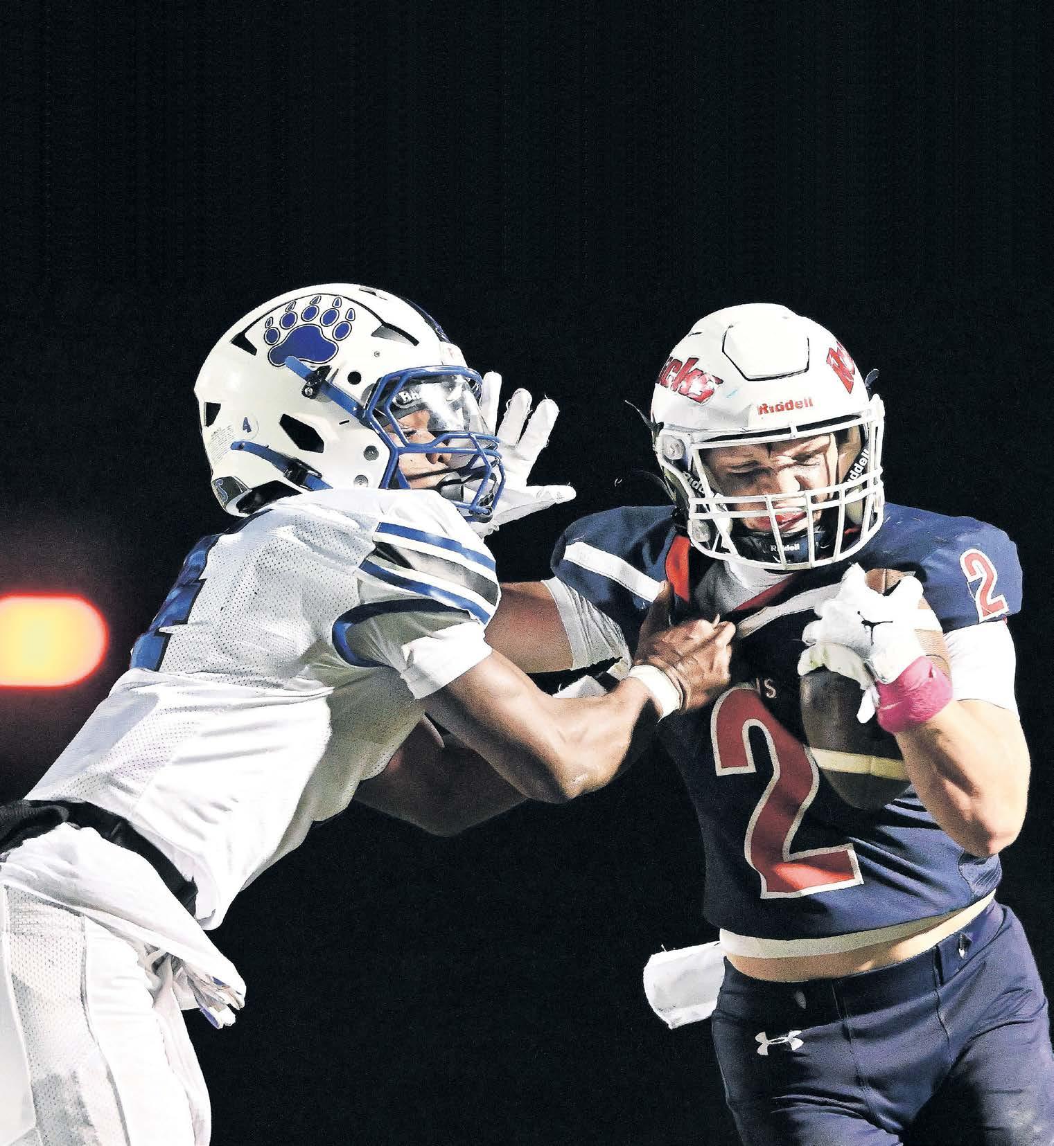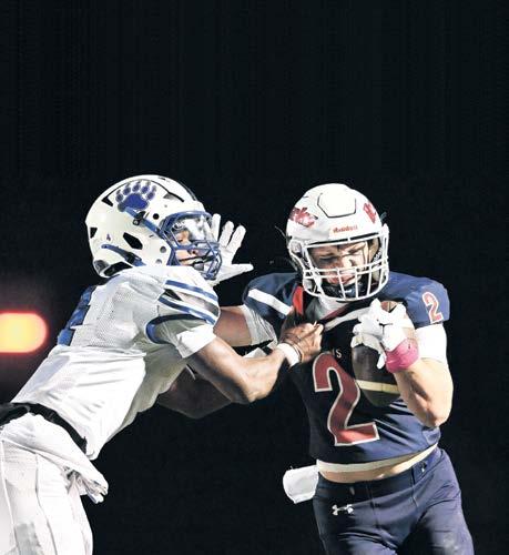 Conestoga Valley’s Teagan Ruble, right, fights off a tackle by Elizabethtown’s Prince Wratto during the firsthalf of an L-L League Section Two football game in Witmer on Oct. 10.