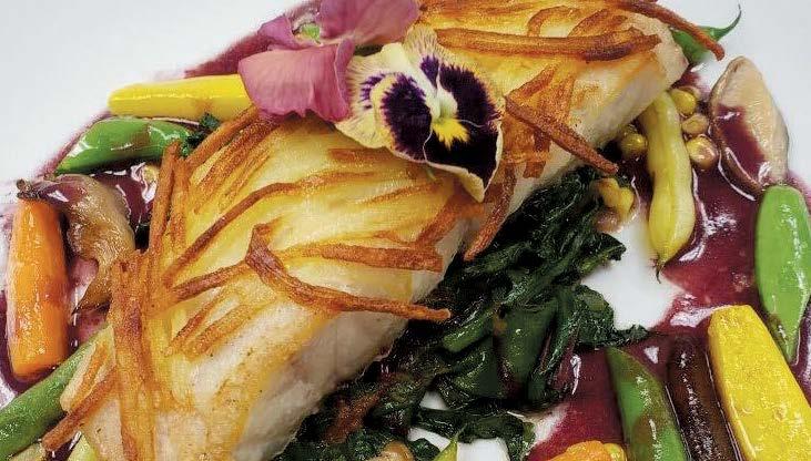 Pan se ared Chil ean se a bass wi th sautéed mushro oms, gr ap e toma to es , cape rs , Kalama ta olives simmered in garlic an d white wine