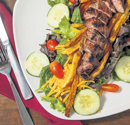 Crisp mixed greens, cheddar cheese, pickled red onion, and English cucumbers, ser ved with sliced bistro tenderloin steak, topped with fresh cut French fries