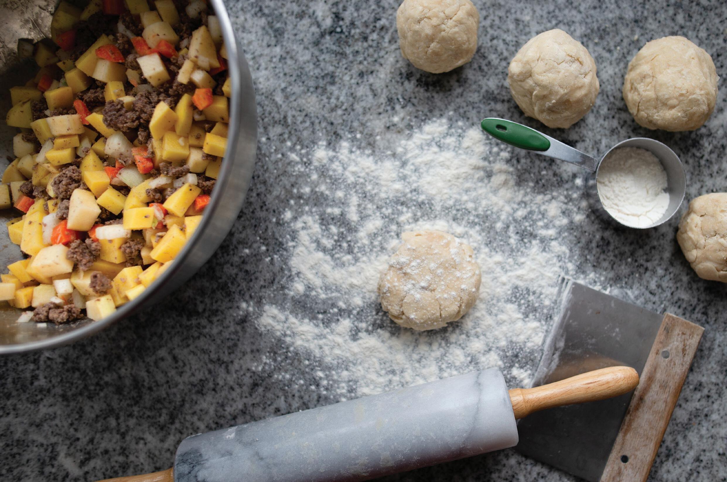 Divide dough into 6 equal pieces and roll into balls. Flour a flat surface and roll out dough balls into an approximately 6-inch diameter. Place about 1 cup of filling on one half of each piece of rolled out dough. Put 1 Tbsp of butter on top of the filling, and fold the dough over. Crimp edges to seal. Poke with a fork a couple of times on top to allow airflow while cooking.
