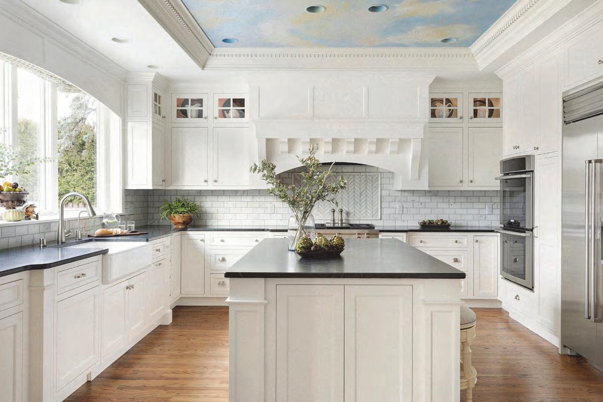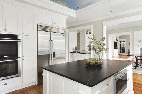 A large island with enough room to seat the entire family anchors the kitchen, which has designated room for entertaining and prep work. The kitchen is conveniently nestled between a sizable, well-appointed butler’s pantry with room for appliances and a second oven and a dining room with access to a deck overlooking a wooded area. “The open-yet-defined kitchen, dining and great room layout encourages connection while still giving each space its own identity,” David says.