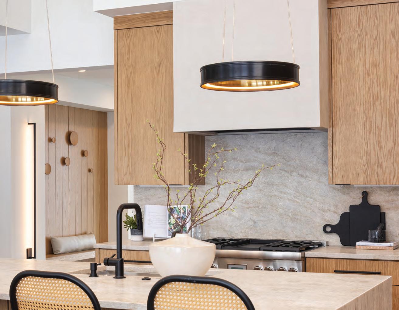 A primary suite on the main level, with other bedrooms and a guest suite located on the lower level, provides extra privacy for parents and allows for the home to grow with the family’s changing needs. “Without a second story above the main living areas, we’re able to design more dramatic ceiling volumes, exposed beams and taller glass walls that bring in natural light and uninterrupted views,” David says. “This trend is a response to lifestyle, aesthetics and improved livability.”