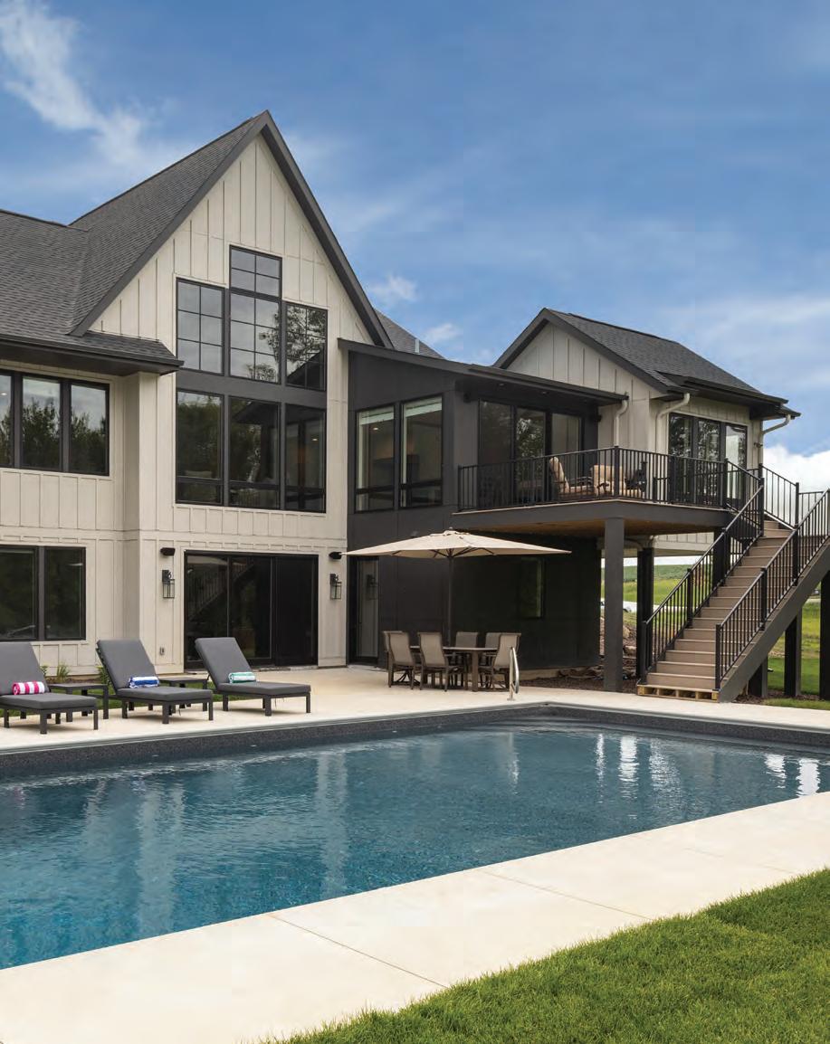 An exterior deck connects the upstairs dining room to the pool area. “Outdoor living was a priority, so the main level walks out to expansive decks and patios that cascade down to the pool level,” David says.