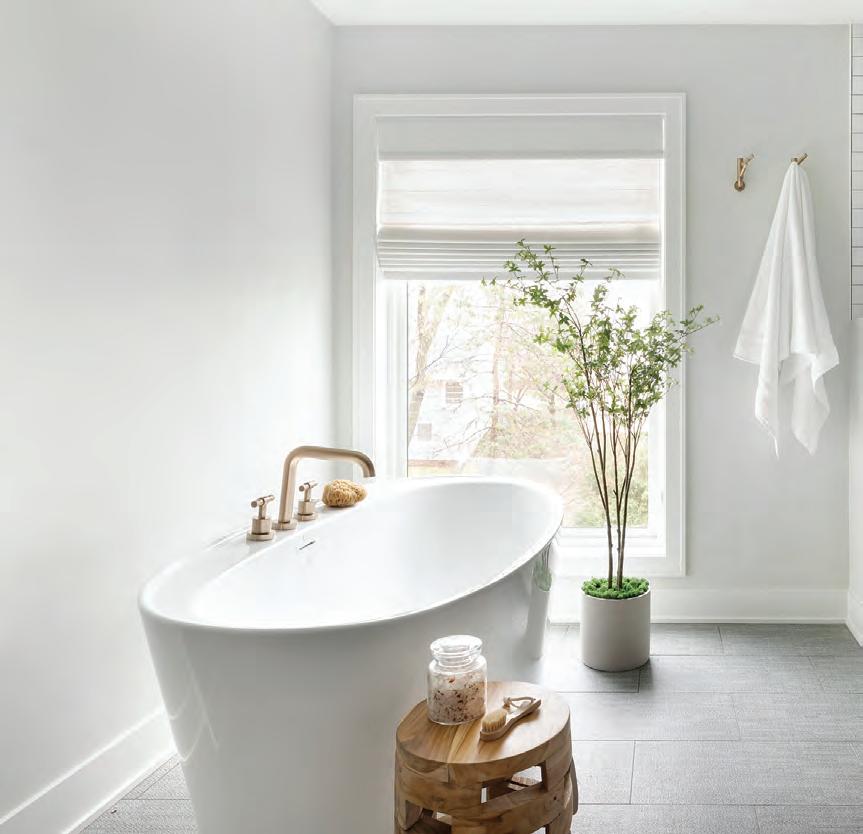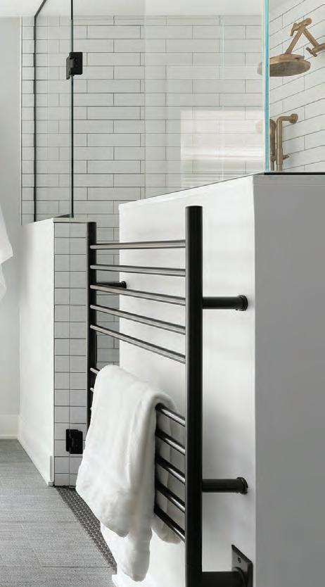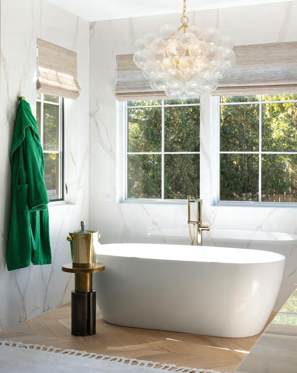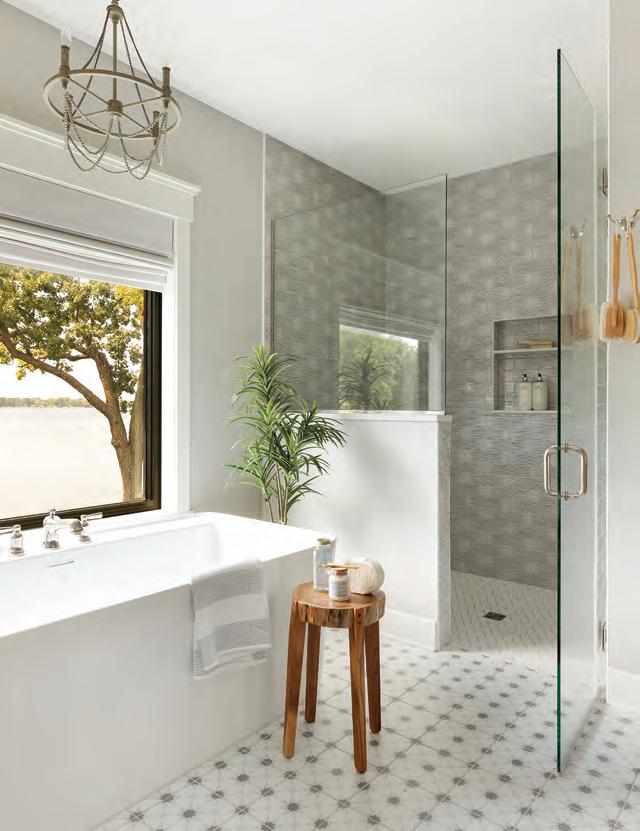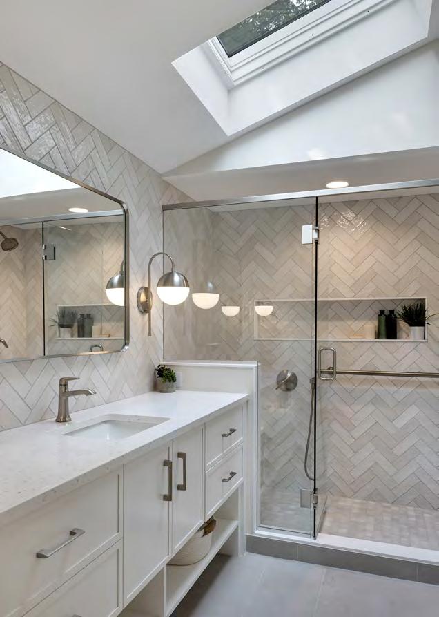 Upstairs, the primary bathroom—also the victim of a slapdash makeover—needed attention. It had a good layout, plenty of light and vaulted ceilings; so Weekley Elioff focused on updating the finishes and improving function. A custom vanity with one sink, per the Joneses’ wishes, and plenty of counter space and storage to fit snugly between the walls (adding a new half shower wall on one side) was installed. The space was polished off with Corian shower sills, glossy Zelligeinspired herringbone tile, retro single-globe sconces and water-resistant brushed nickel fixtures that are low maintenance. A bench, grab bar and handheld showerhead, along with nonslip floor tile, address safety and age-in-place considerations.