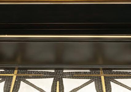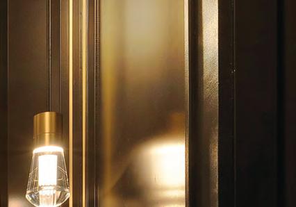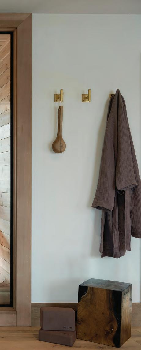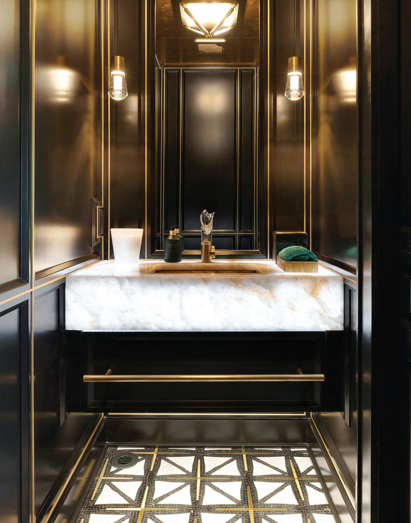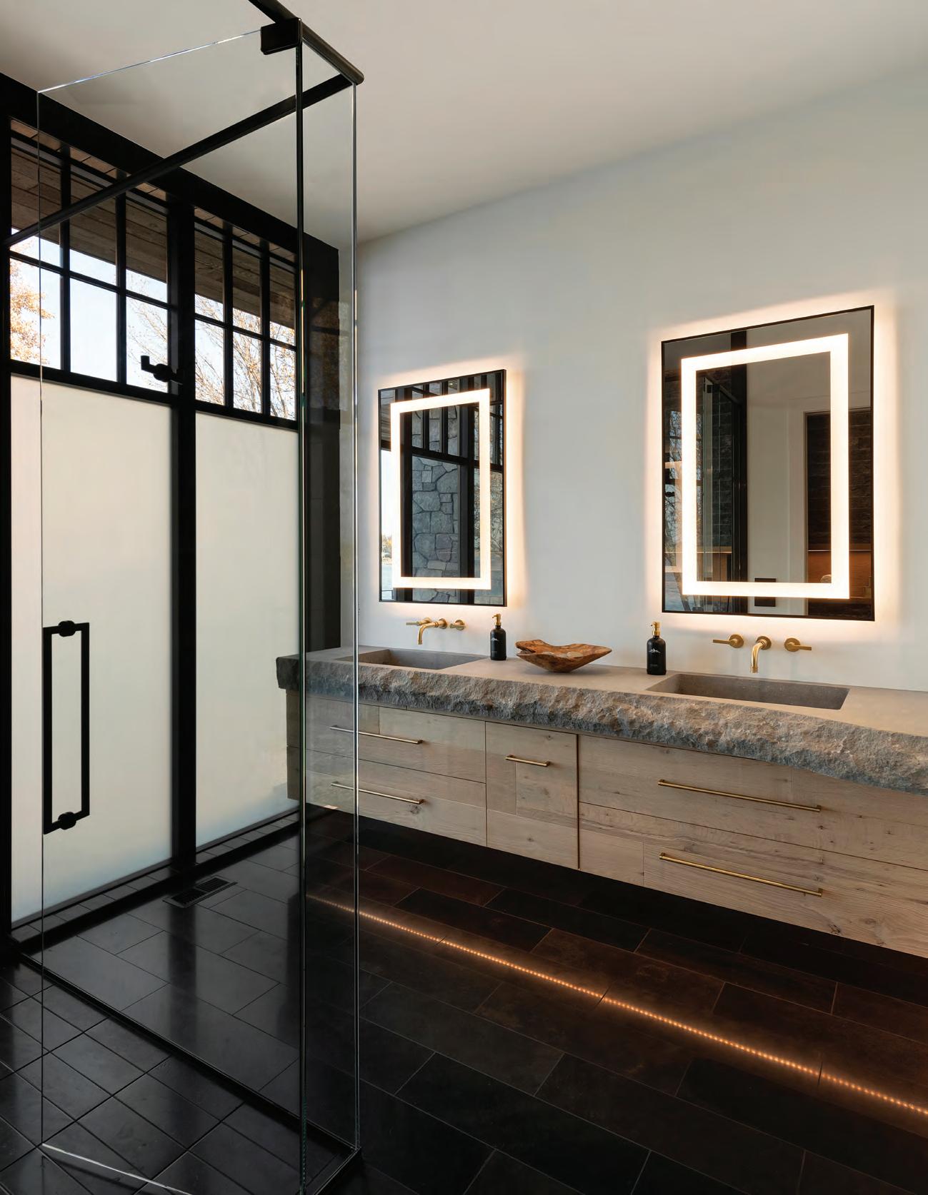 Upstairs, the primary bathroom—also the victim of a slapdash makeover—needed attention. It had a good layout, plenty of light and vaulted ceilings; so Weekley Elioff focused on updating the finishes and improving function. A custom vanity with one sink, per the Joneses’ wishes, and plenty of counter space and storage to fit snugly between the walls (adding a new half shower wall on one side) was installed. The space was polished off with Corian shower sills, glossy Zelligeinspired herringbone tile, retro single-globe sconces and water-resistant brushed nickel fixtures that are low maintenance. A bench, grab bar and handheld showerhead, along with nonslip floor tile, address safety and age-in-place considerations.