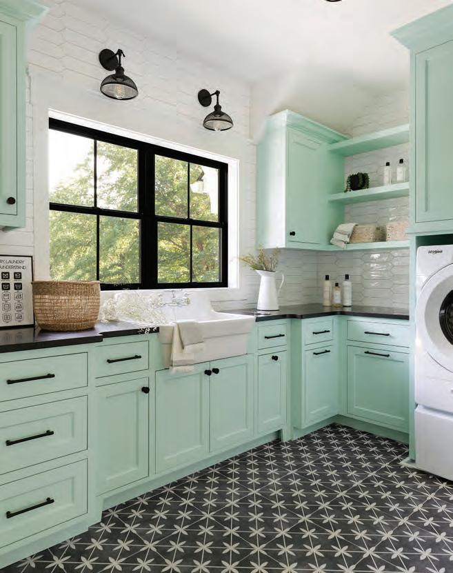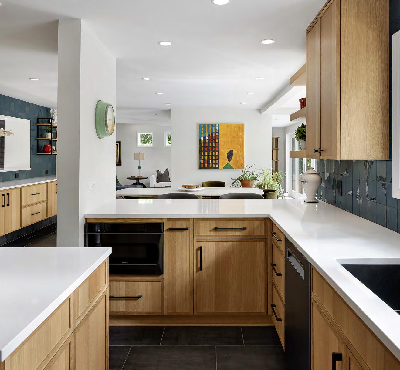 via custom, rift-sawn white oak cabinets. There’s a modern appliance garage with bifold doors, large drawers for pots and pans, a slotted knife drawer and another for organizing spices. Striking walls of dark turquoise tile with matte and glossy parts break up the cabinet massing and infuse the space with personality. “The tile has color, texture and sparkle but isn’t too busy,” Weekley Elioff says. The adjacent laundry room received similar treatment, with crisp white-painted cabinets, the same Cambria Smithfield countertops as the kitchen, and a rod for air-drying clothes, per Kendall’s request.
