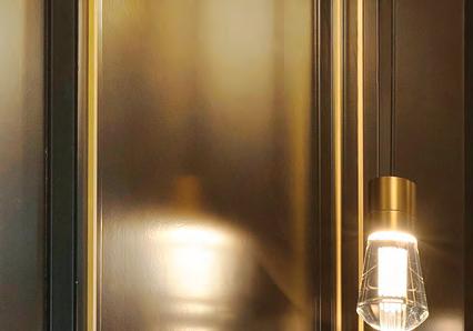 upstairs, Kendall and Jeff decided to add the basement to the project. This is where Weekley Elioff’s favorite feature is. “The bar. I adore this piece,” she says. What looks like a freestanding piece of furniture is actually built-in, trimmed out in white oak, with matte black cabinets and two types of lighting (undercounter and spotlights). It’s definitely a moment with brass cabinet pulls, gold strips between the backsplash tile and a subtle metallic gold swirl in the countertops. “Jeff enjoys whiskey and wine and wanted a bar, not a mini-kitchen,” Weekley Elioff explains.