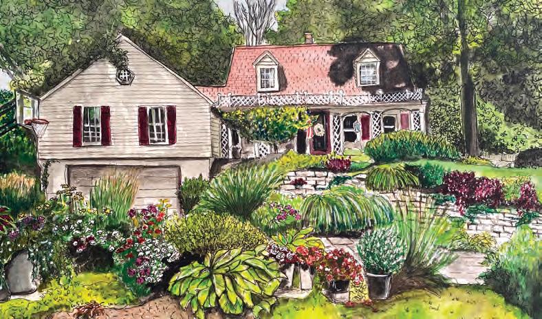 “After my kids were grown and I had more time on my hands, I wanted to get back to my art, and I’m all about making something for someone,” Dummer says. She started with pet portraits and now does cabins, churches and landscapes—anything meaningful that holds a special story in someone’s life. “The first house I did was the home I grew up in, in Ames, Iowa,” she says. “It was an old Tudorstyle home, and I just loved it.”