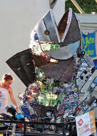 More than a decade ago, Scrappy was created by Twin Cities sculptor Mary Johnson for St. Croix RiverFest. Since his birth, he’s evolved into an annual community art project—part sculpture, part environmental statement and part neighborhood mascot. Each summer, volunteer artists comb the riverbanks, gathering bottle caps, lost sunglasses and any other mysterious items that might present themselves. After that, it’s a process of sorting, scrubbing and transforming those items into “Scrappy scales.”