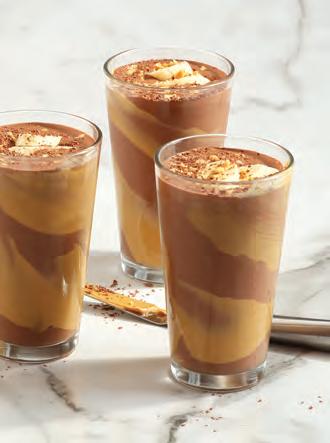 In the order listed, combine all ingredients in a blender. Blend until smooth. Serve topped with banana slices, chocolate shavings and a drizzle of peanut butter.