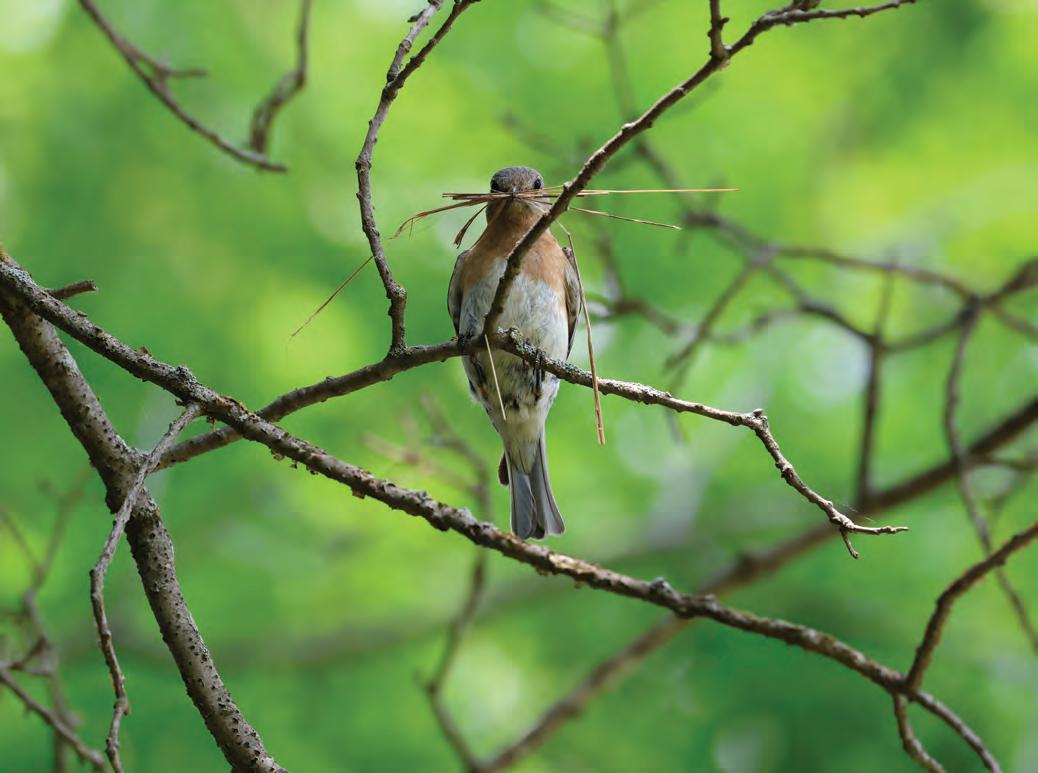 Bluebirds have a special place in Nancy Klinger’s heart. The area resident volunteers as a bluebird trail monitor at Belwin Conservancy in Afton and often brings her camera along while hiking the trails. “The term that I use to describe my photography is enthusiast. The term that I use to describe my love of bluebirds is fanatical!” Klinger says. On one April stroll, she heard a familiar “cheer, cheer, cheer,” and spotted an Eastern Bluebird with her beak full of nesting material. “I usually follow the rule of thirds for my bird photos, but I wanted her to be in the center of the shot,” Klinger says. “Isn’t she beautiful?” —Zoe Yates