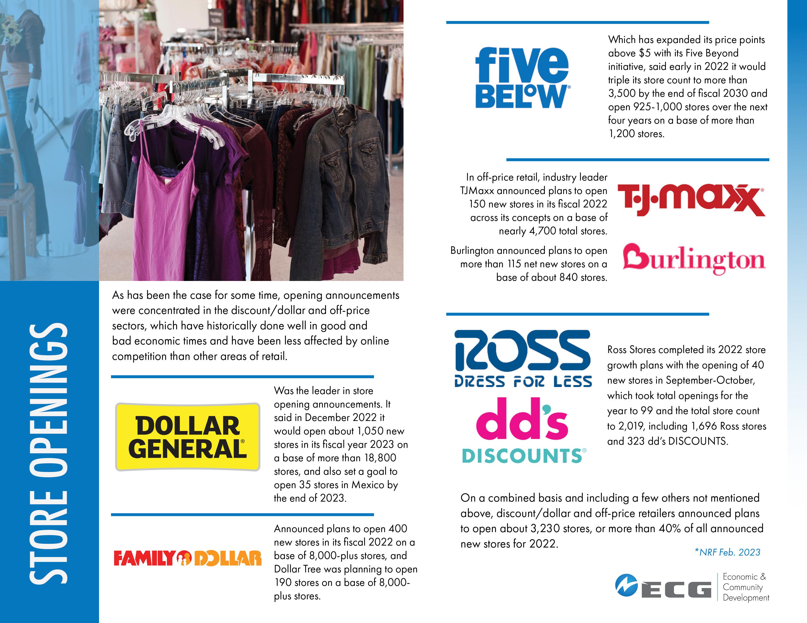Burlington in November, the off-price retailer said it has plans to open 500 to 600 net new stores over the next five years as part of a long-term goal to reach 2,000. As of the end of the third quarter, Burlington had 893.