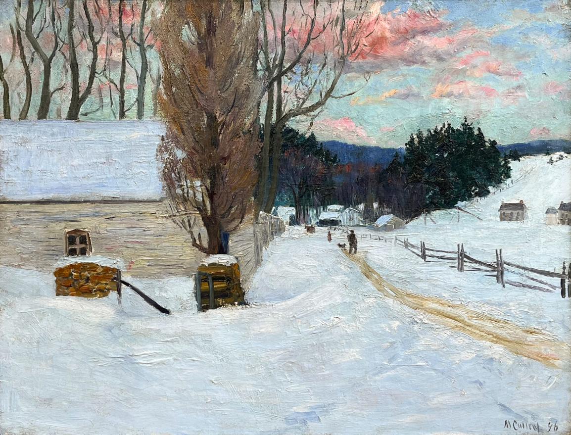 tranquil beauty of Sainte-Anne-de-Beaupré. This work embodies the serene stillness of rural Quebec in winter, a theme that resonated deeply with Cullen. The scene depicts a rural Quebec landscape blanketed in snow, with a cluster of low buildings nestled into the land and distant hills receding into a pale winter sky. Cullen’s muted palette—dominated by cool whites, greys, and subtle blues—is punctuated by warmer earth tones in the buildings and trees, which anchor the composition and provide contrast. The brushstrokes are loose and gestural, especially in the snow, where subtle variations in tone suggest shadow, texture, and the play of light on a frozen surface. His ability to capture the crisp, luminous quality of snow and the warmth of structures nestled under the pink sky makes this piece particularly compelling. The horse and sleigh in the distance and the man with his dog add to the charm and narrative of this idyllic scene. In Winter, Beaupré, Cullen transforms a simple rural view into something evocative and enduring. Through light and paint, he conveys the lived experience of a Canadian winter, offering a deeply local vision with universal resonance.