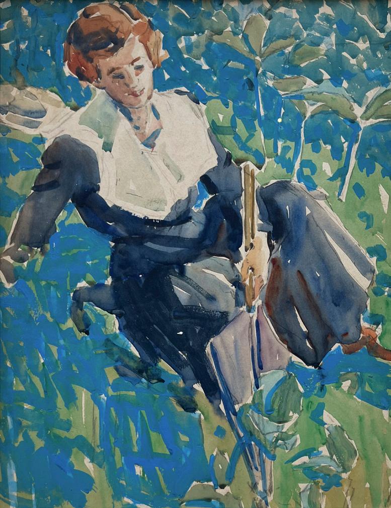 are rendered in an uncomplicated fashion, full of gesture and animation. Warm, sunlit colour bathes the scene in soft blues, pinks, and yellows, and shadows are cast almost directly below the trees, suggesting a high, hot sun. Brownell’s skill in capturing light, atmosphere, and movement is clear here. His loose but deliberate brushwork is evidence of his strong academic training and also his exploratory artistic eye.