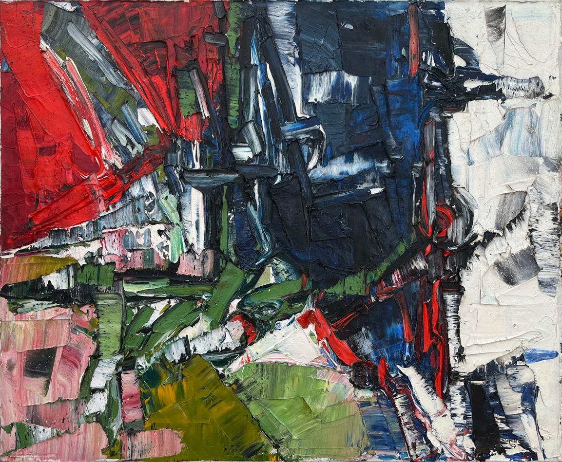 The 1950s marked the most pivotal decade in Riopelle’s career, during which he reached full artistic maturity. It is during this time that Riopelle experiments with his groundbreaking and distinctive “mosaic” painting style, characterized by the thick, sculptural application of paint using palette knives. This technique created richly textured surfaces and vibrant, dynamic compositions. He often applied paint directly from the tube, producing a near three-dimensional effect. Bold, contrasting hues imbued his work with energy and movement, reflecting his deep commitment to exploring the physical and emotional poten-