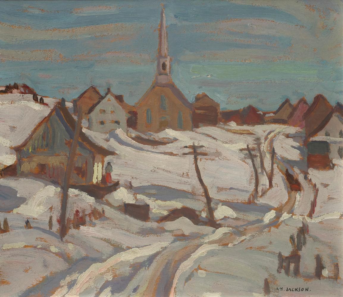 Jackson’s use of colour and line creates a cohesive, almost musical rhythm throughout the scene, evoking the pulse of life in the remote village during winter. St. Fidèle, Quebec, is not just a depiction of place— it is a celebration of endurance, community, and the beauty of Canada’s rural heritage. Through stylized forms and expressive technique, Jackson transforms a quiet landscape into a deeply felt tribute to Quebec.