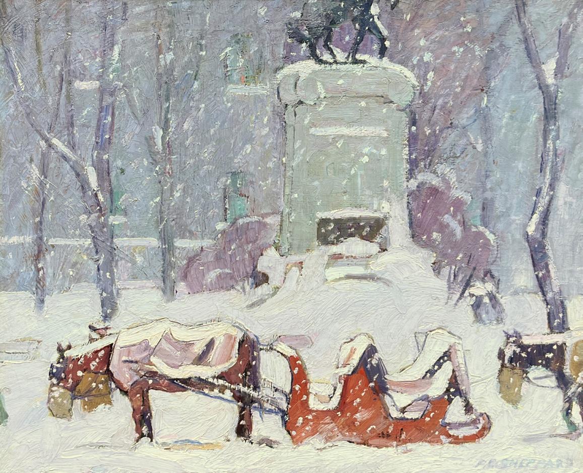Cabstand, Winter, Dominion Square, Montreal, c. 1926 oil on canvas, 20” x 24.5”