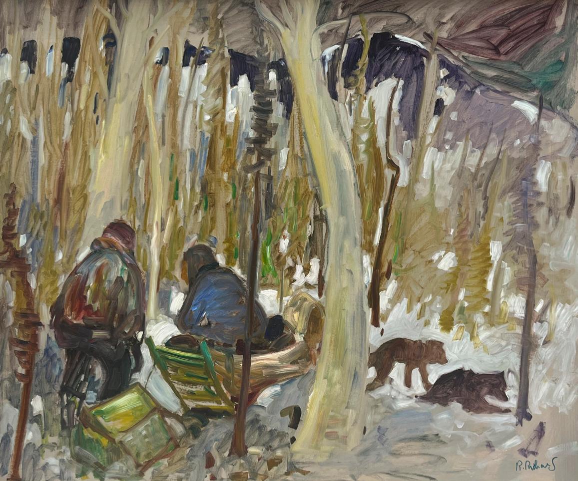 ArretenForetdeDeuxTrappeurs depicts two trappers paused in a dense forest landscape, surrounded by snow-laden trees and underbrush. The composition is loosely structured yet carefully balanced. The two figures, though small in scale, are central and immediately draw the viewer’s eye. Their placement amid the thick forest conveys both their physical presence in the land and their vulnerability within it. A comtemplative mood focusing on companionship and a moment of human presence in nature resonates with Richard’s desire to authentically portray the rhythms of life in Canada’s remote regions.