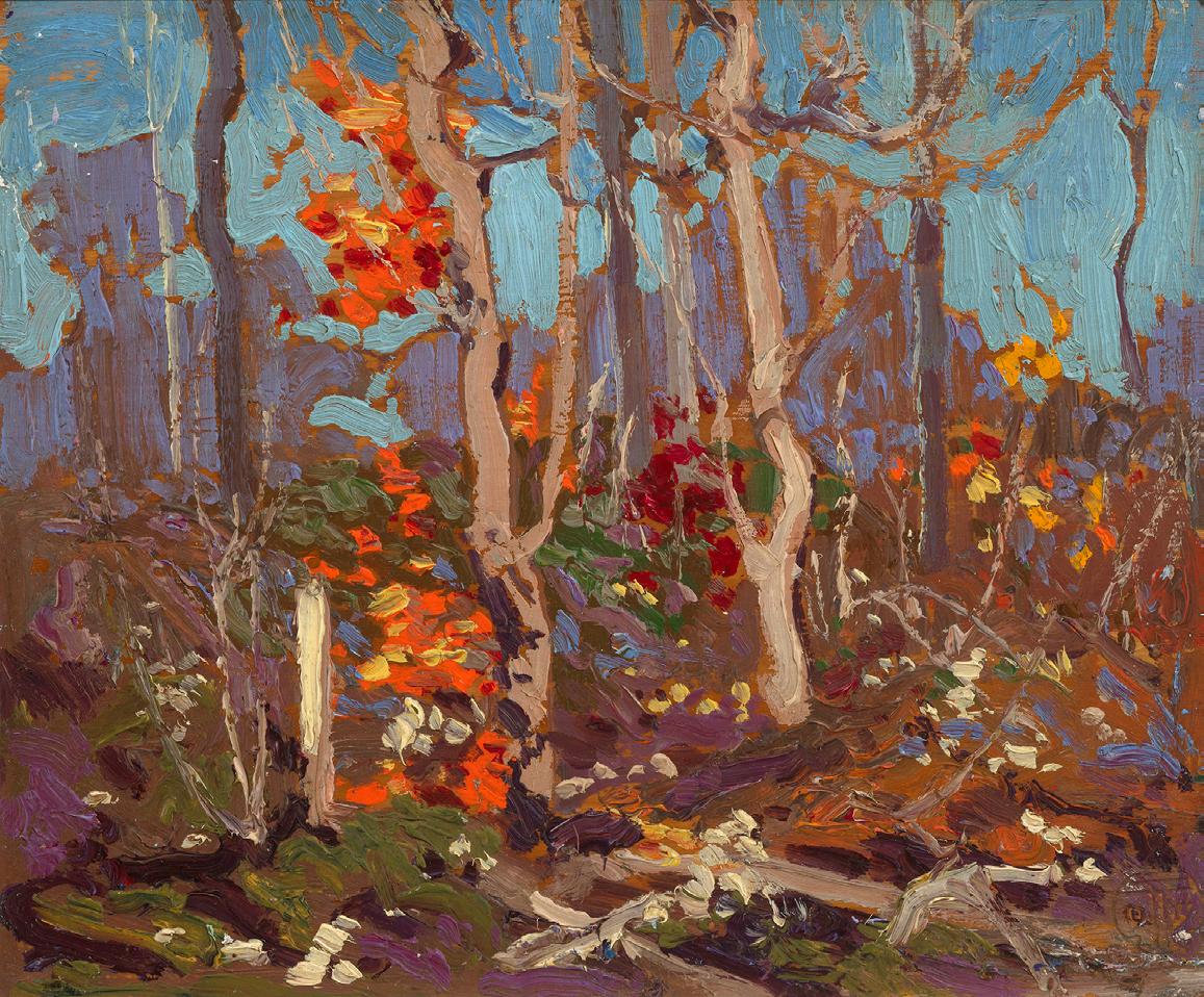 It was Thomson’s frequent sketching trips into Algonquin Park that catalyzed the transformation of his style, marked by bold brushstrokes, a rich, almost Fauvist palette, and a deep sensitivity to light and atmosphere. Where some saw small panels as a means of documenting the scene to then be translated to canvas, Thomson saw the potential of both small panels and large canvases to carry the same drama and excitement. One of these compelling panels, Ragged Oaks, painted just a year before his mysterious death, exemplifies this transformation. The panel reveals