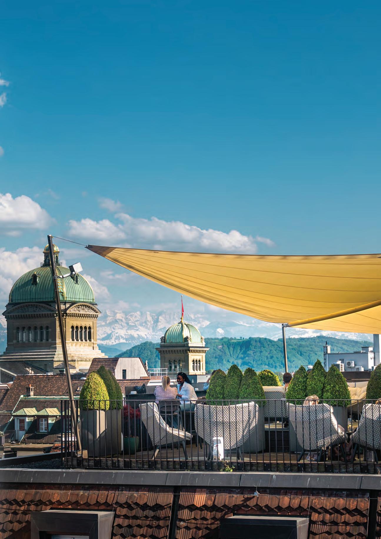 Ein Drink in der Hand, der Blick schweift über Bern – willkommen auf der Dachterrasse des Hotel Schweizerhof Bern & Spa mit Panoramablick auf das Bundeshaus, die Schweizer Alpen und die Berner Altstadt.