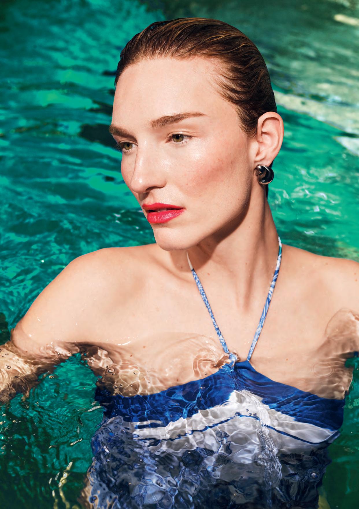Abschminken und die Haut gründlich reinigen, egal wie spät es ist. Eine gute Feuchtigkeitspfl ege, weil meine Haut sofort darauf reagiert. Und täglich Sonnenschutz. Das sind für mich die absoluten Basics, die ich wirklich nie auslasse.