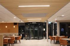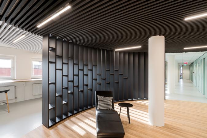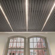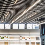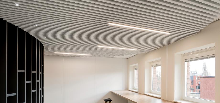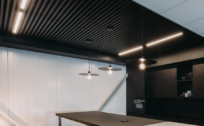 Eine Innovation von Loerakker: Als Alternative zu Pendelleuchten können diese L14 Leuch ten nahtlos in die Montageschlitze der Derako® Deckenpaneele integriert werden. Die Leuchte ersetzt dabei eine Deckenlamelle. Das visuelle Ergebnis ist stets hochwertig und ausgewogen. Zudem ist die Installation äußerst einfach.