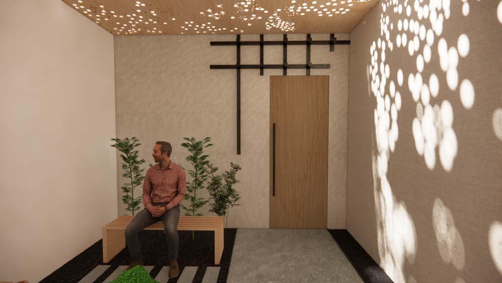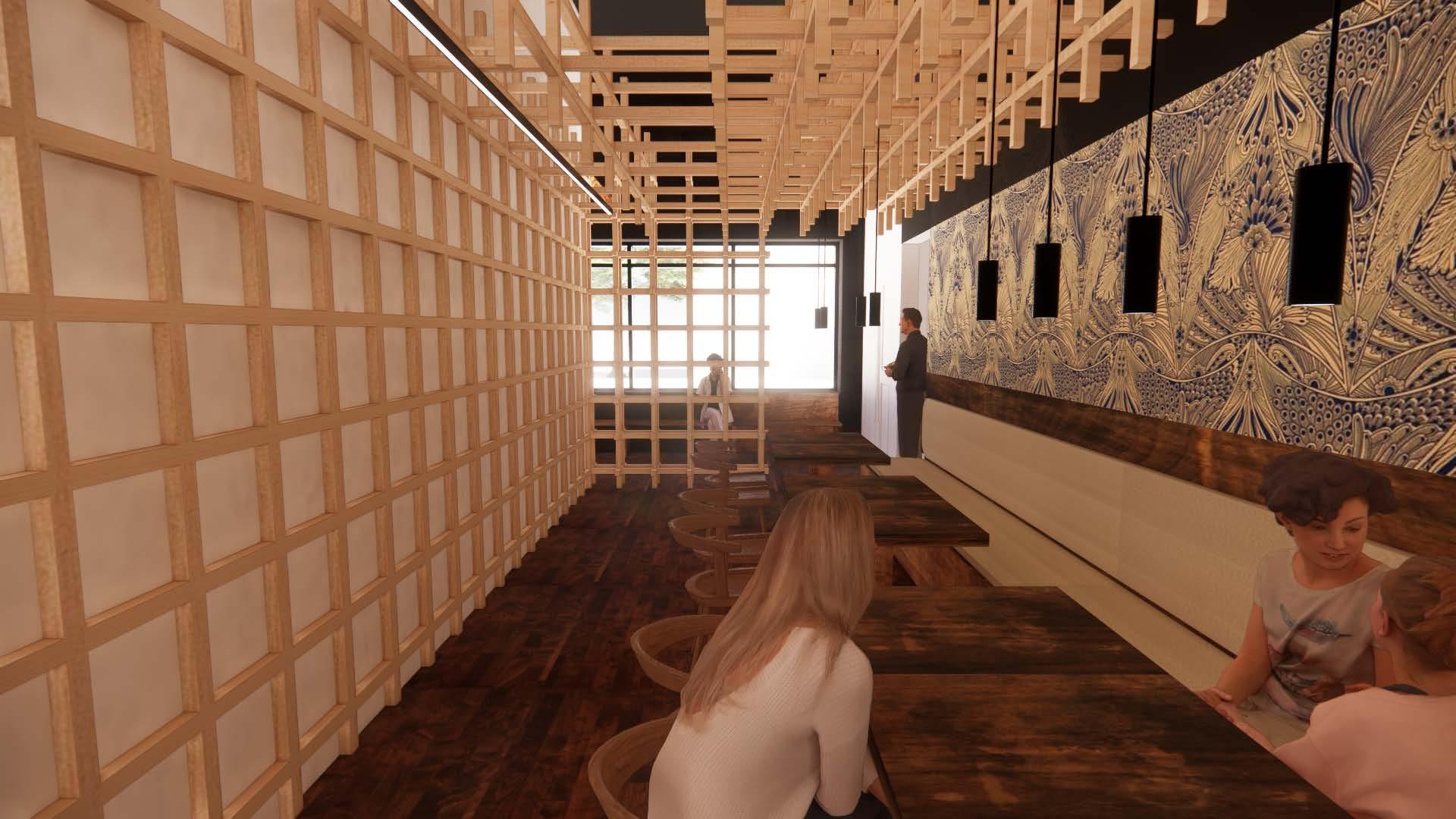 I started with designing a wood feature wall for the new dining expansion. The design scope evolved into extending the wood feature throughout the dining space. The client had expressed interest in doing a graphic on the ceiling, and wanted the waiting room to feel like it was in a garden. In response, I designed a perforated backlit ceiling feature to emulate a cherry blossom tree canopy to fully shape the atmosphere of the waiting room to resemble the outdoors. Media generated via Revit, Rhino 3D, Enscape, and Adobe Creative Suite.