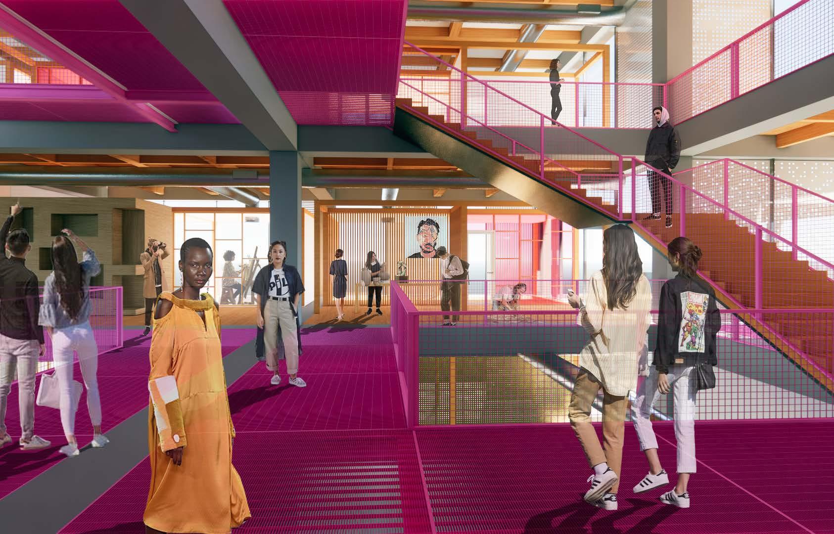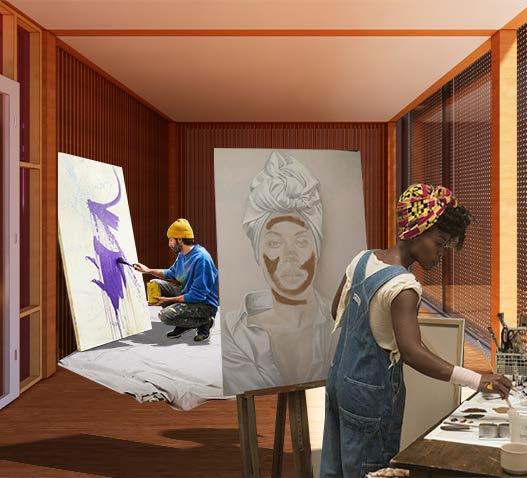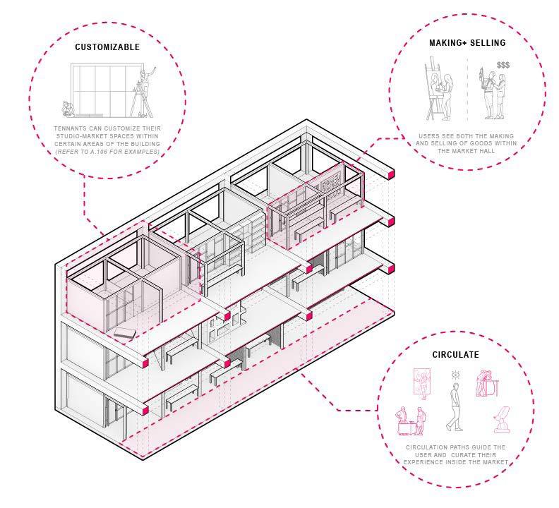 This market hall aims to curate a creative and dynamic environment through the use of framework, materiality, and views throughout the building. The building utilizes a grid of concrete, wood, and metal materials to define program and circulation throughout the building, providing a sense of organization within the dyanicism. Within the established grid, users of the building can alter their studio and market spaces using the infrastructure put in place. This is intended to act as the space for creative activities to occur within, which will build a certain culture and atmosphere within the building. Media generated using Rhino 3D, Enscape and the Adobe Suite.