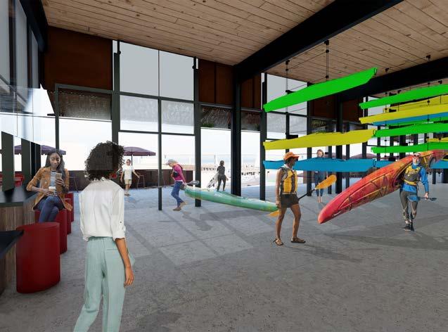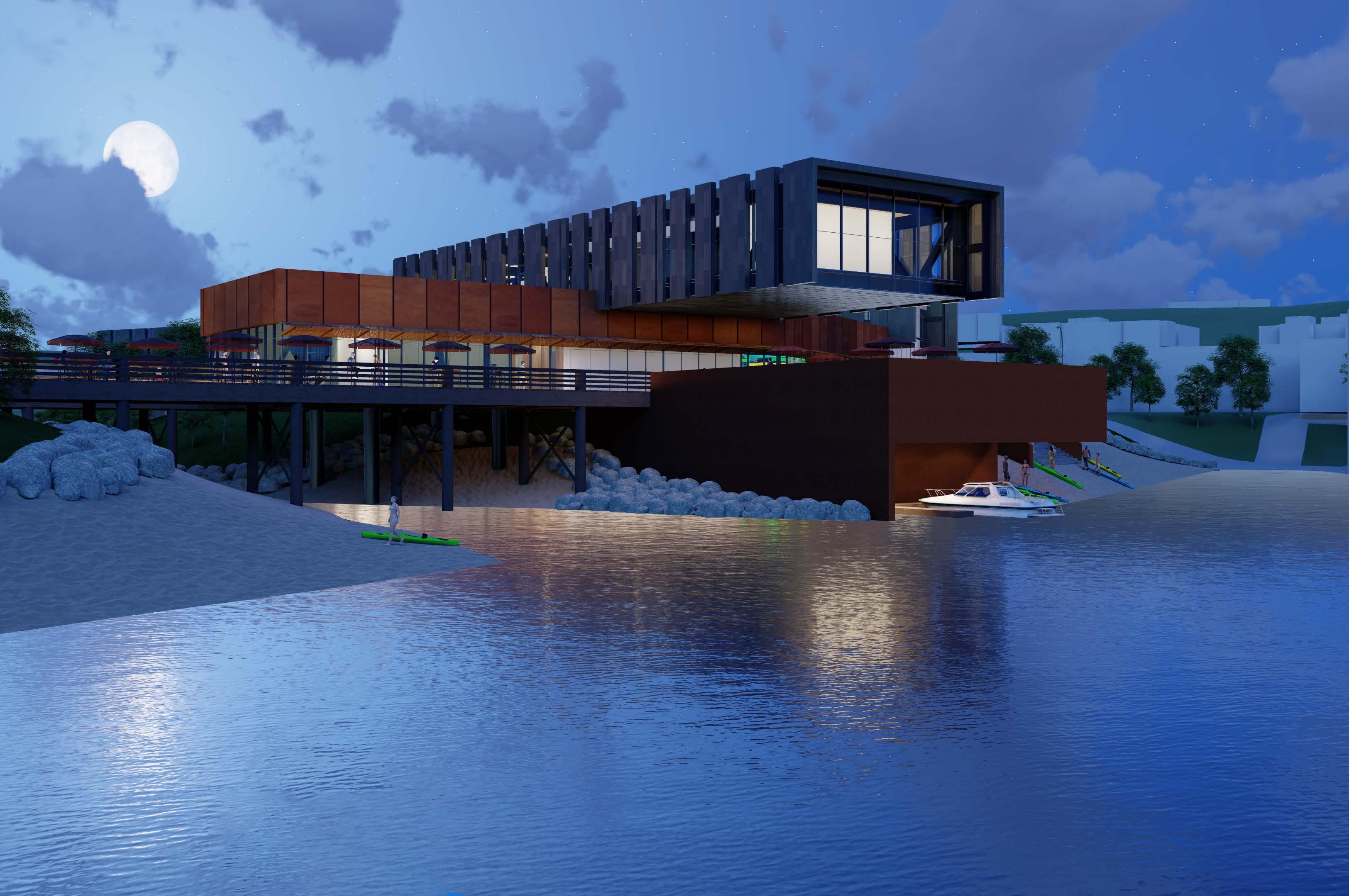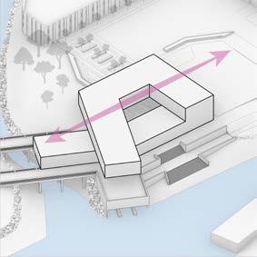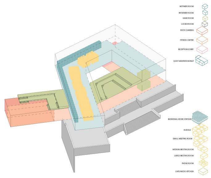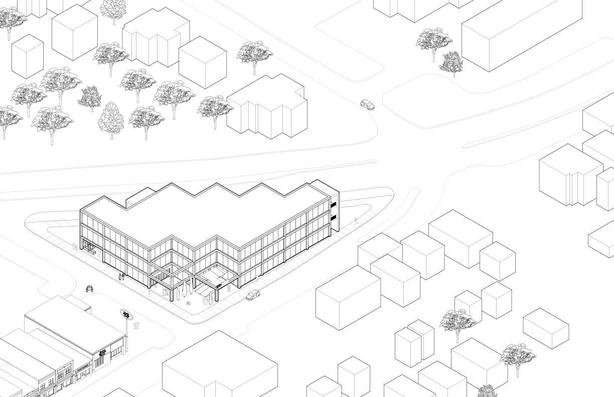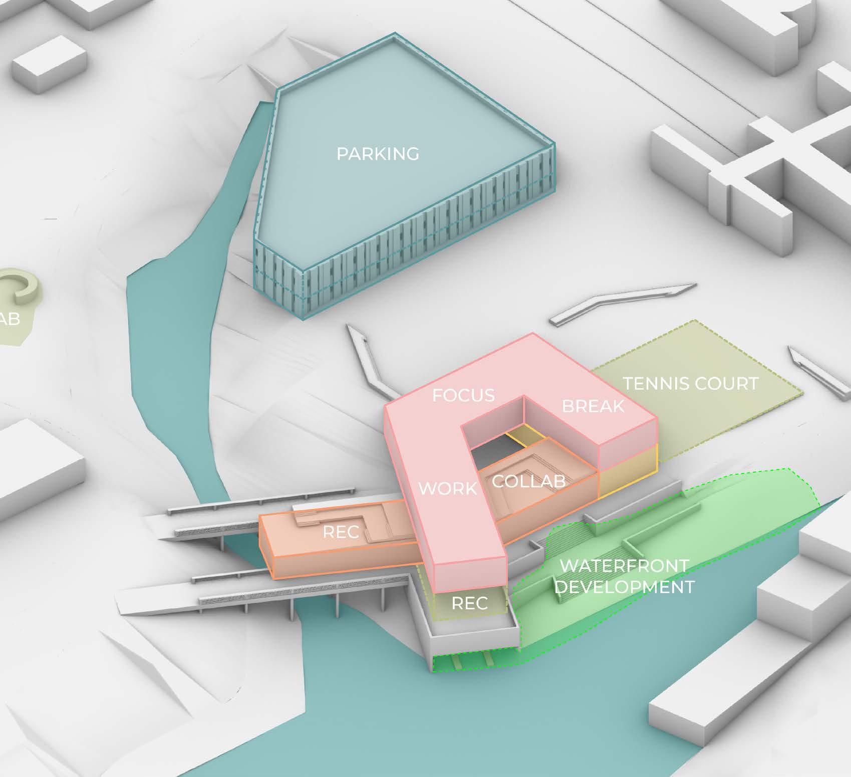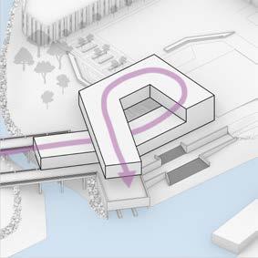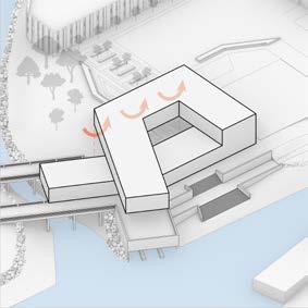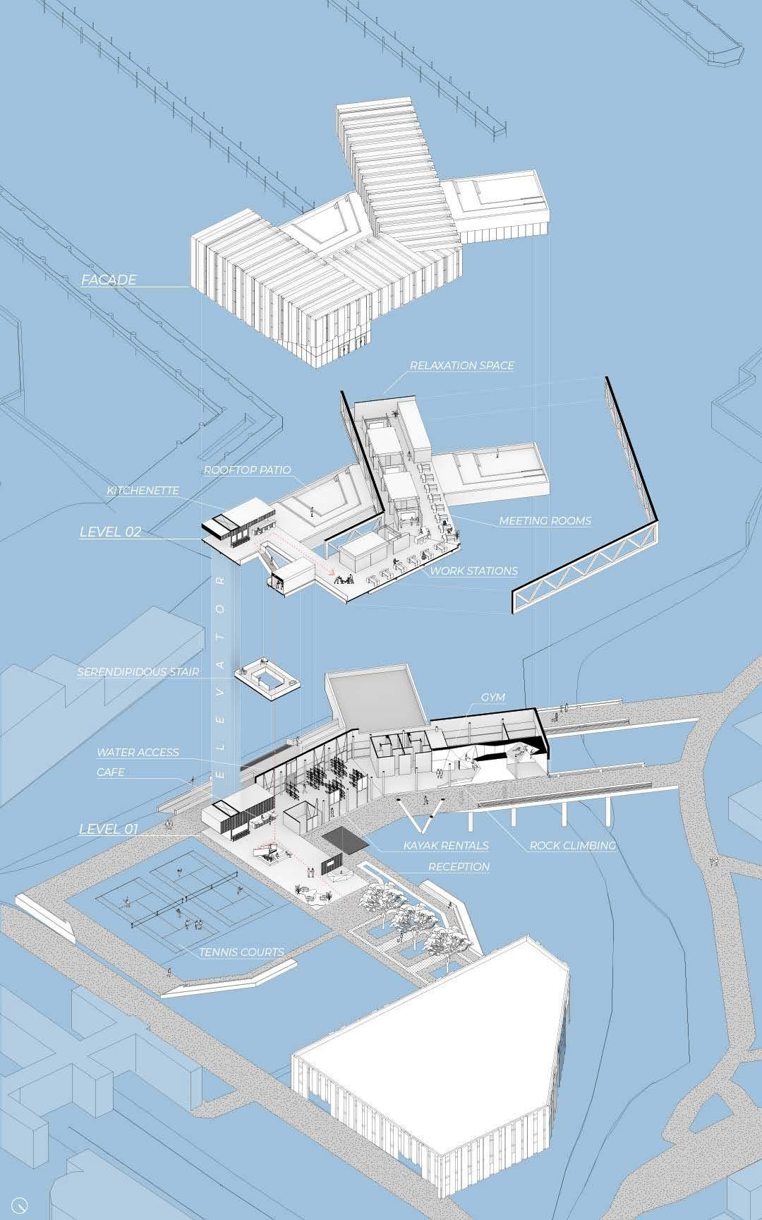 Located under an hour from NYC, these new satellite offices boast waterfront views of the Hudson River and the Manhattan skyline. The design integrates with the surrounding community by extending the Hudson River Walk through the building. The structure’s spiral form mirrors the workday, placing leisure activities at the beginning and end. Winding upward, it creates a private employee patio and office views without compromising community waterfront space. Twisting downward, it features open hanger doors and a boardwalk inviting locals to a terrace cafe, bouldering gym, and boat rentals, redefining the modern workplace. Media generated through Rhino 3D, Lumion, and the Adobe Creative Suite.
