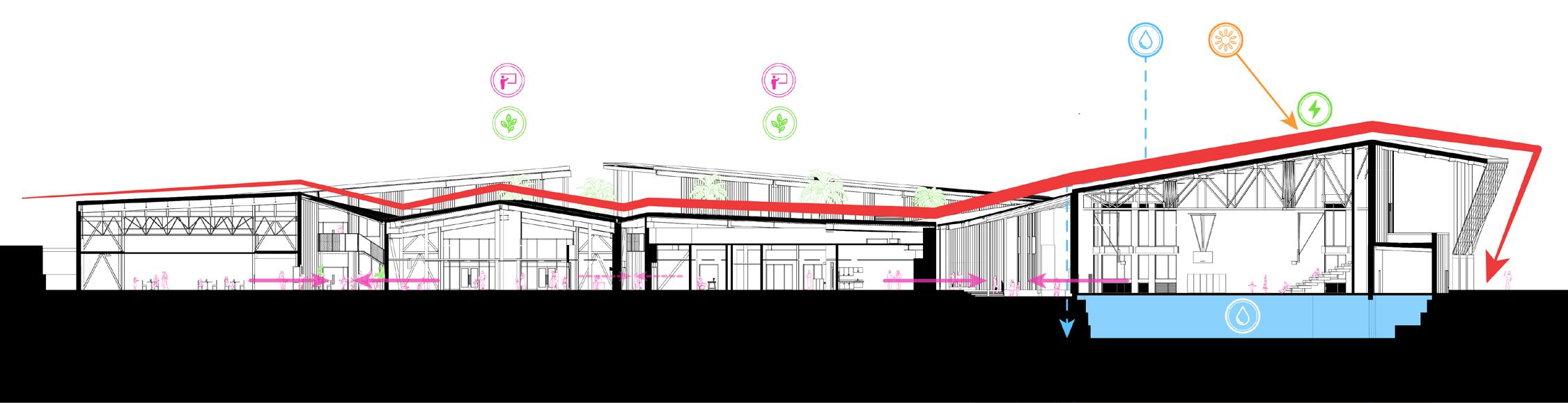 Working with the site’s existing buildings overlaid with the additional new structures creates various opportunities for discovery along the journey. By recladding and upgrading the existing buildings, relocating program, incorporating shed roofs to help lessen the scale difference between the single and 2-story new buildings and incorporating the signature Charlotte Amalie red roof, the new Lockhart campus ties directly into the design of the Charlotte Amalie High School and will be the pride of students and staff alike. Key design features of the existing, like the lush landscaping islands, will be transformed to elevate the experience of the students by opening up the front of the classroom and collaboration spaces so visual connections to the exterior are available for all students. Traveling through the site becomes an exploratory journey, with pockets of discovery throughout. Examples of this include the branding and wayfinding that I designed are at the forefront of the design. Nods to the mountain and sea concept