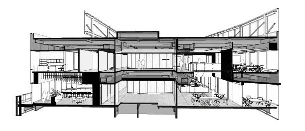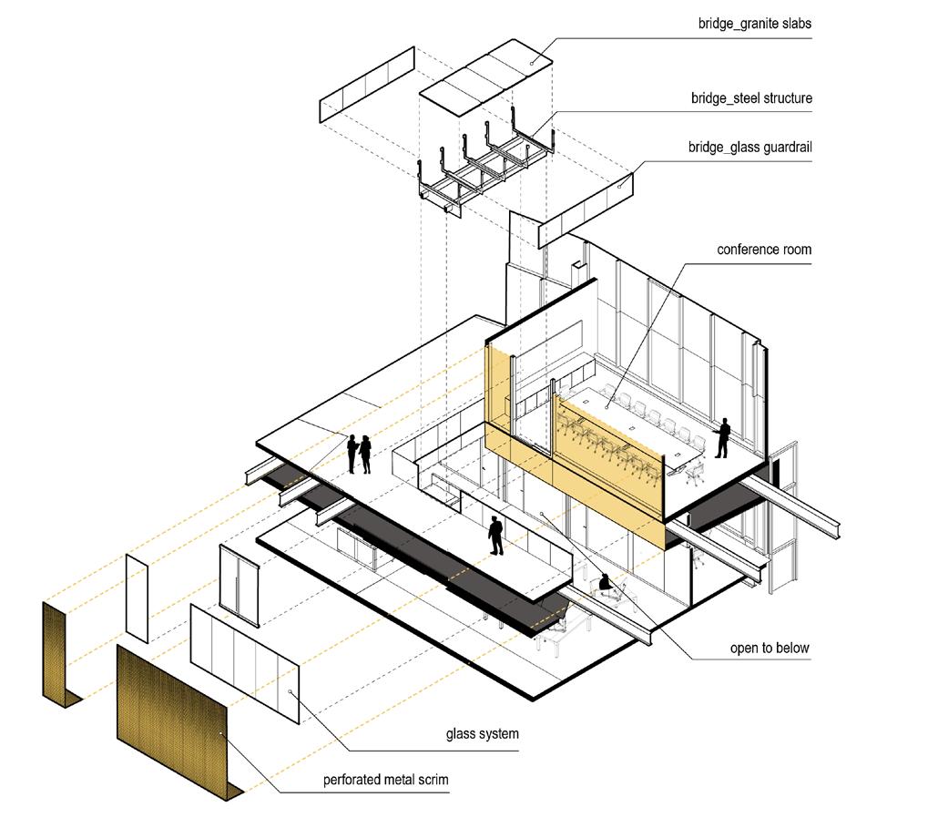 Bridges Trust is another project that I was able to work on the awards representation for. In order to focus on the many different details within this space, I created a multitude of diagrams. The zone particularly focused on in these images is the scrim detail that envelopes this conference room that almost seems to float above the workspace below. To carve into the space, I decided to do an exploded isometric using Rhino 3D and Adobe Illustrator to represent the structural system of the bridge and scrim arrangement. The project is filled with details, so I also included a section perspective to highlight the overall arrangement and flow of the space.