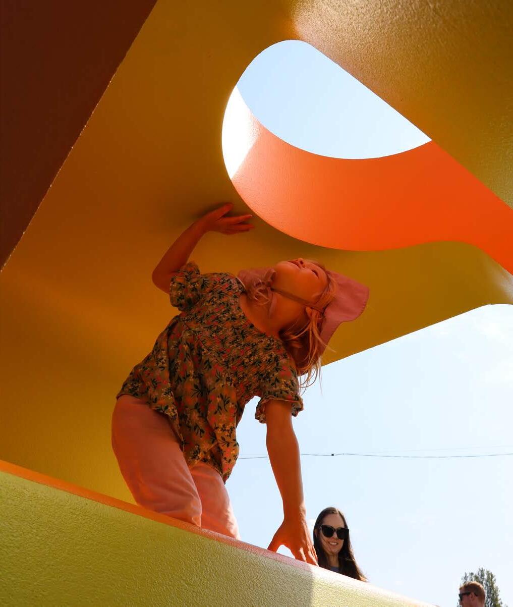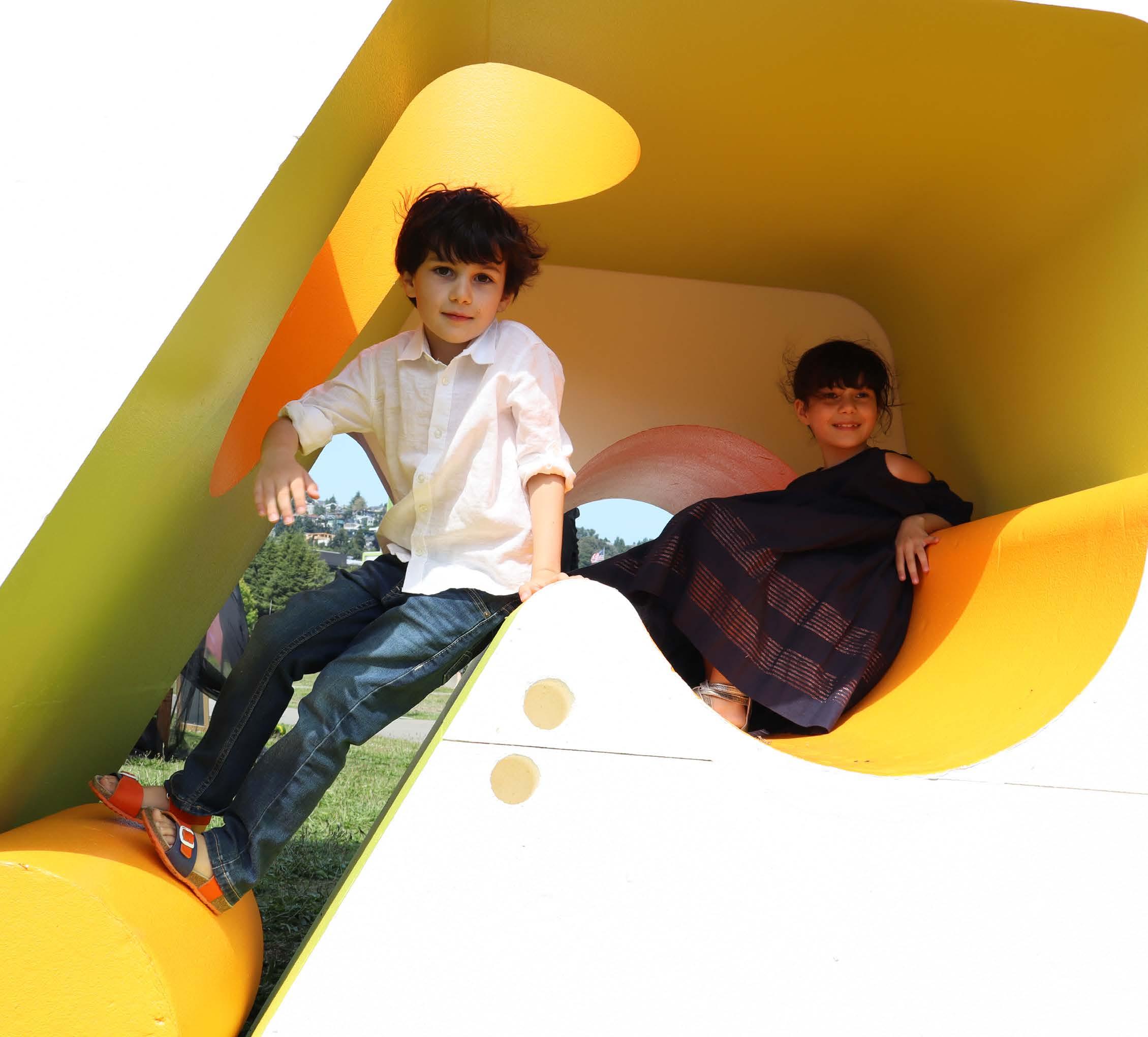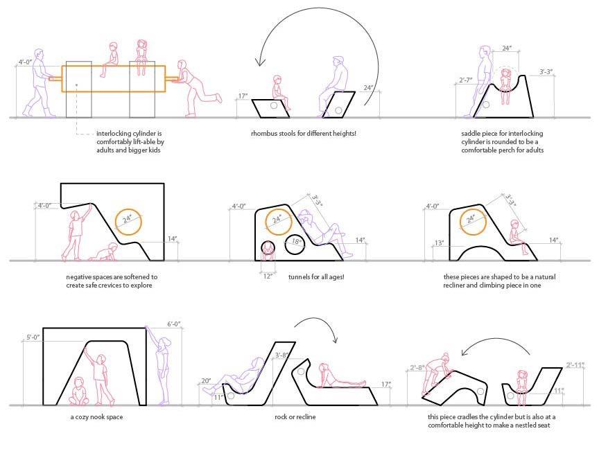 The ergonomic design of our shapes encourages interaction from all ages. The interlocking cylinder is comfortably lift-able by adults and bigger kids. The puzzle pieces and tunnels are for relaxation or play. Negative spaces are softened to create safe crevices to explore that frame portals of the natural environment.