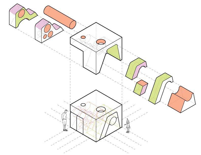 This built installation aims to challenge this as multiple, moveable pieces derive from a larger, more stationary form. Together, these pieces at first glance appear as an unassuming cube with a plain exterior. When the pieces are removed, a bright, colorful, and playful interior is revealed. Each element encourages a multitude of configurations that were curated to intuitively create three different themes of interaction: play, rest, and connection.