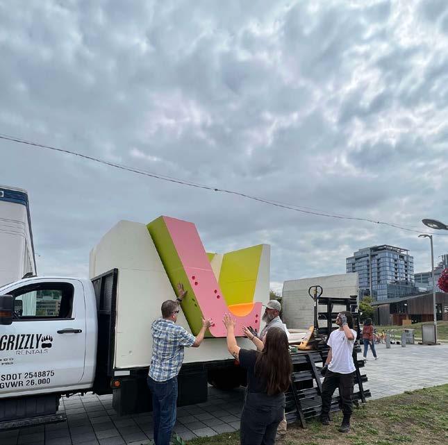 can be placed on the back of a flatbed truck, ready to be fully assembled on-site within minutes. It is split into a green and pink half, with faces of the puzzle pieces matching color to color as a guide for users to reassemble the puzzle without the use of verbal instructions.