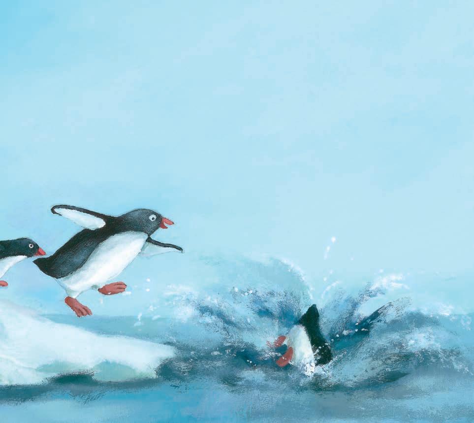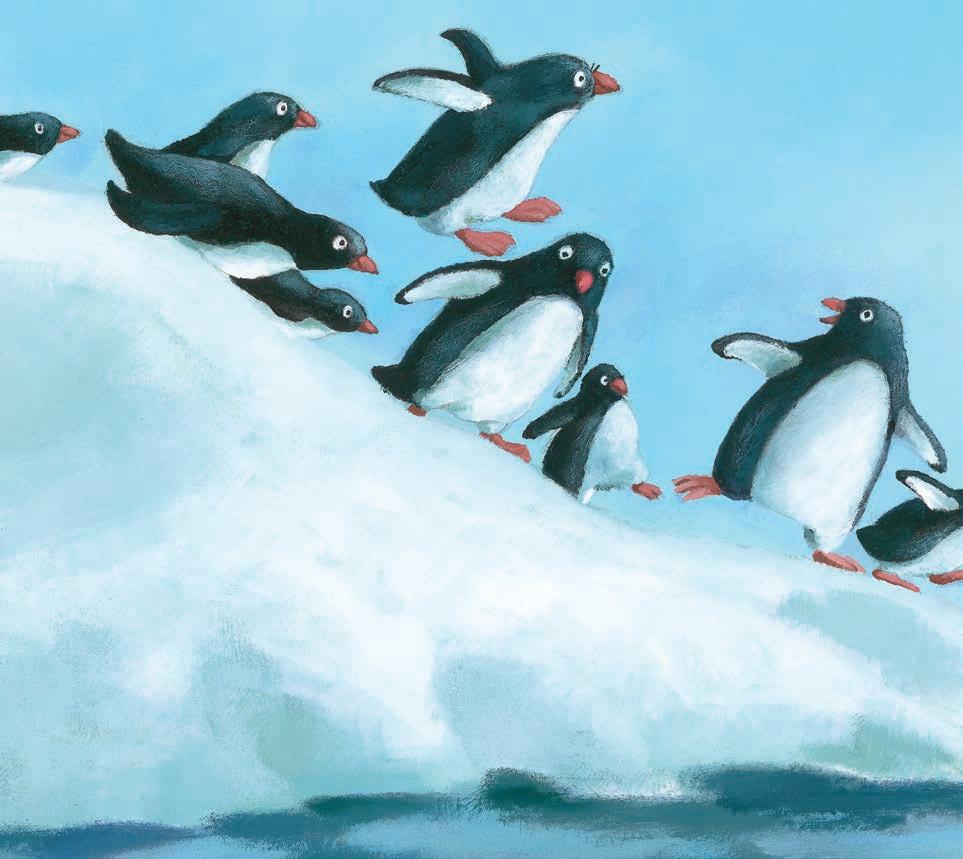 Nada más despertarse, los pingüinos van juntos al agua y pescan unos cuantos peces. Luego se echan una siestecita o pasan el rato charlando tranquilamente. Después juegan a deslizarse por los glaciares o dan un paseo para tomar el fresco. Y cuando han terminado de hacer todo eso, vuelven a empezar, porque es muy divertido.